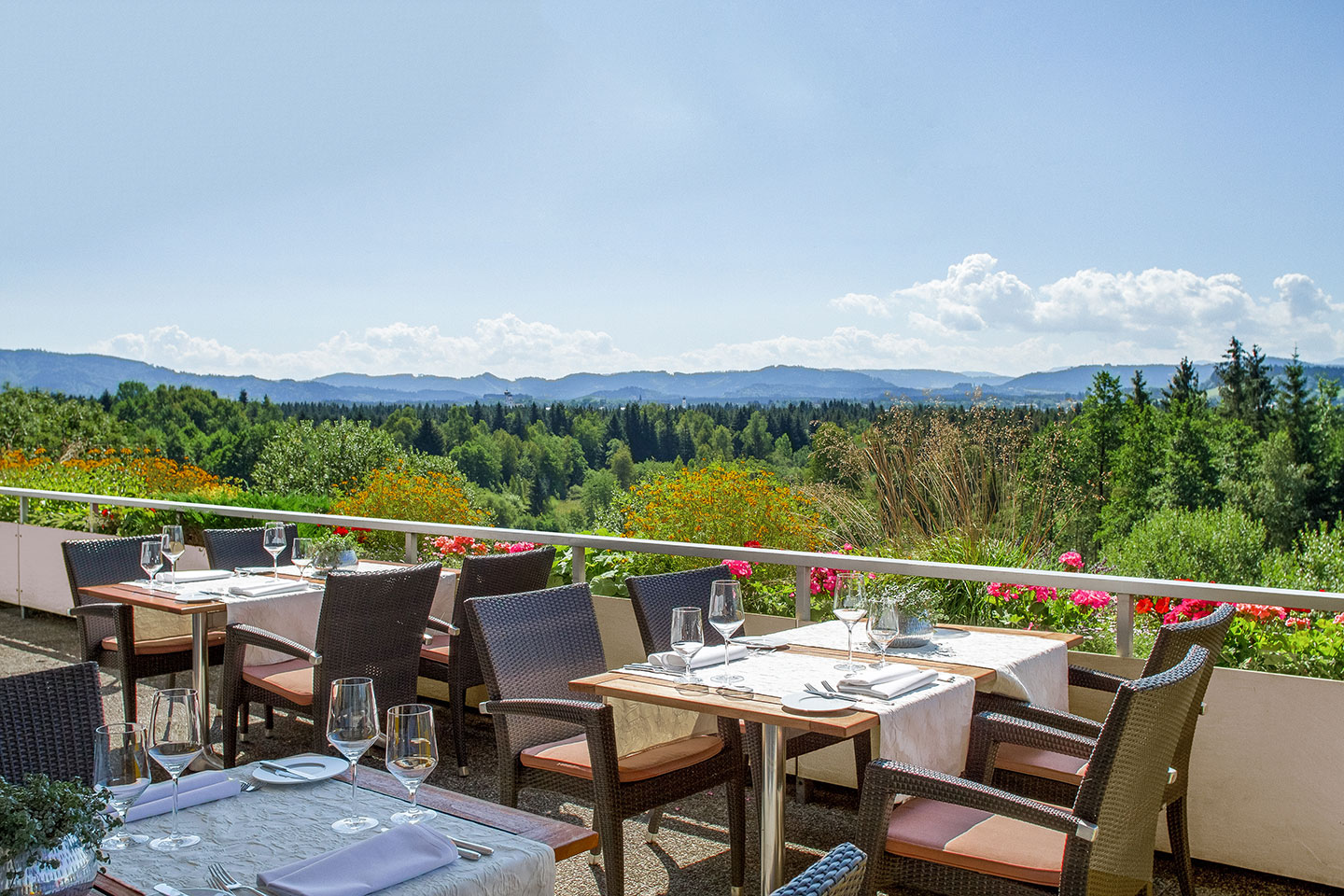 Im Panorama-Restaurant vom Terrassen Hotel geniessen Sie bei herrlicher Aussicht auf die Allgäuer- und Schweizer Bergwelt täglich feine, regionale Köstlichkeiten sowie hausgemachte Kuchen und bunte Eisbecher.