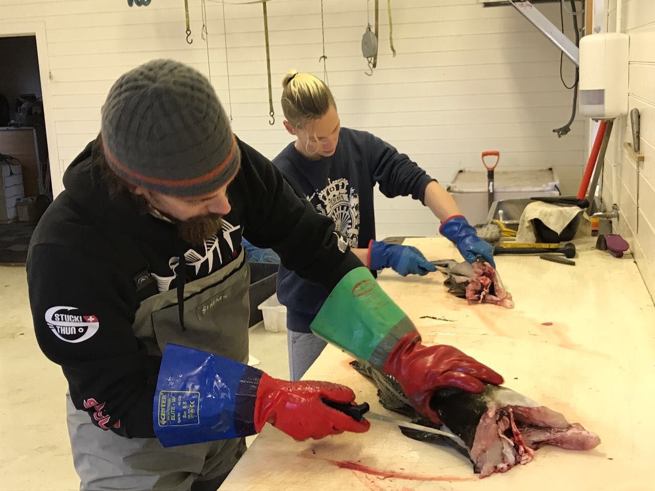 Zu unseren beiden Ferienhäusern gehören eine innenliegende und üppig ausgestattete Filetierhalle mit moderner Wasser-Ablaufanlage und Eismaschine, welche bis 300 Kilogramm Crash Eis am Tag produziert, Gefriergelegenheiten und einer grossen Sitzecke. Eine spezielle Grossraumheizung sorgt im Winter binnen 30 Sekunden für angenehme Temperaturen in der gesamten Halle. Ausserdem gibt es einen kleinen Mini-Shop, wo Sie Köderfische, Pilker und Blinker in bester Qualität nachkaufen können, falls Sie etwas vergessen haben oder weiteres Zubehör benötigen. Ebenfalls bieten wir tiefgefrorenen Köderfisch an.