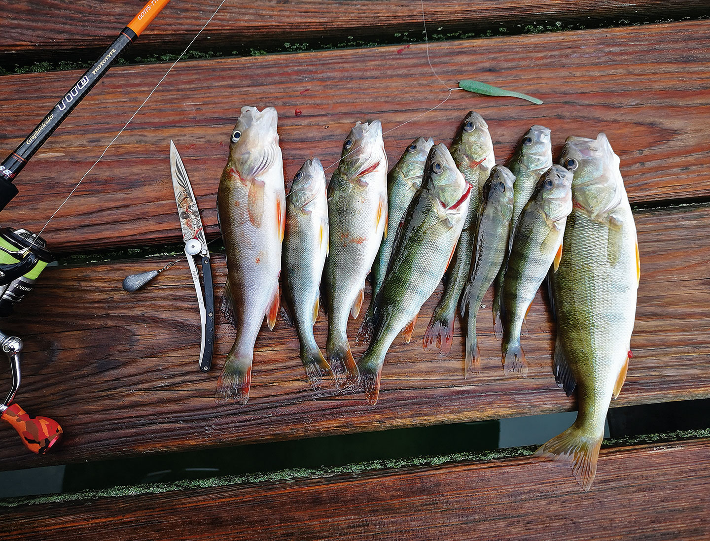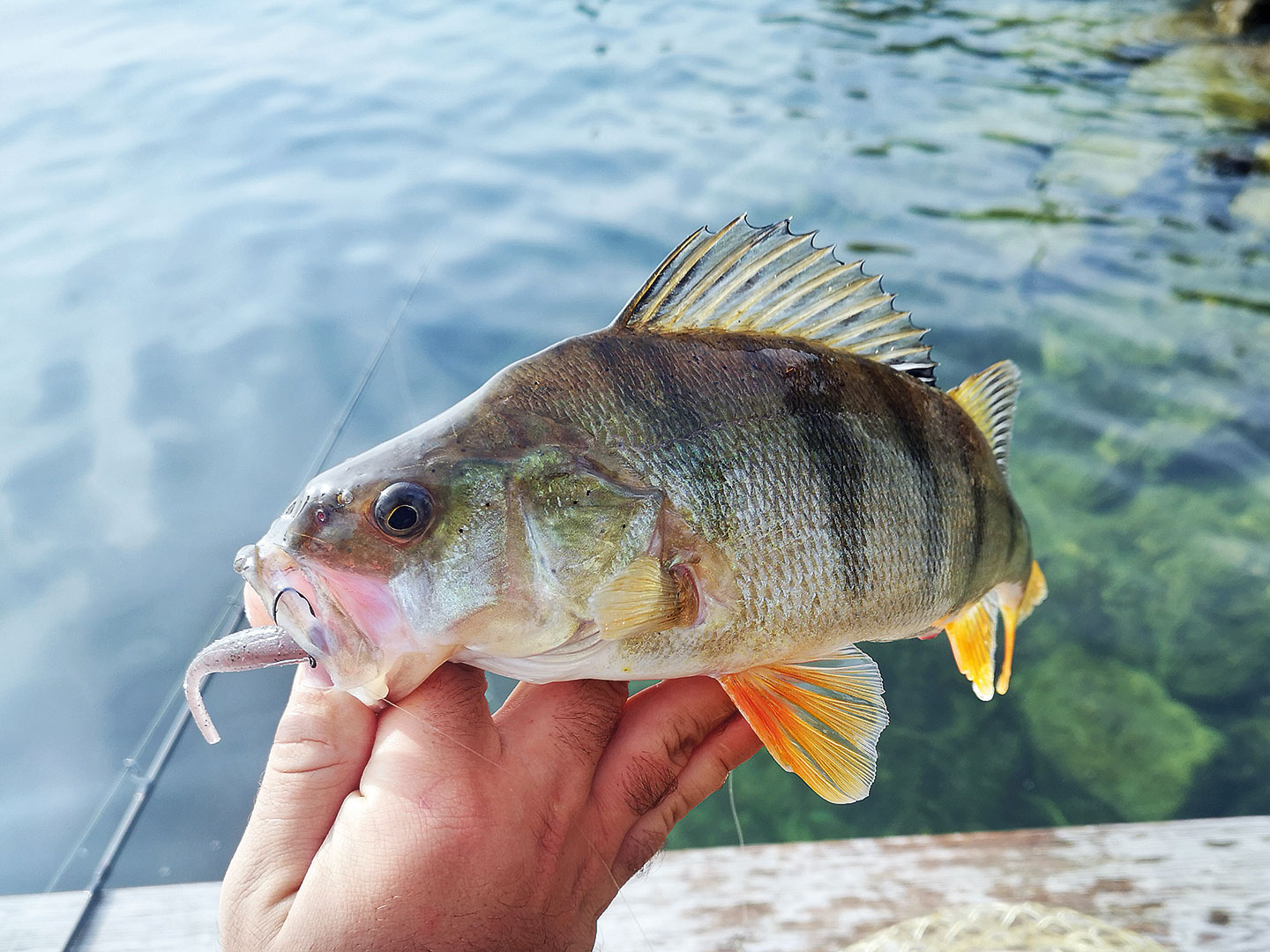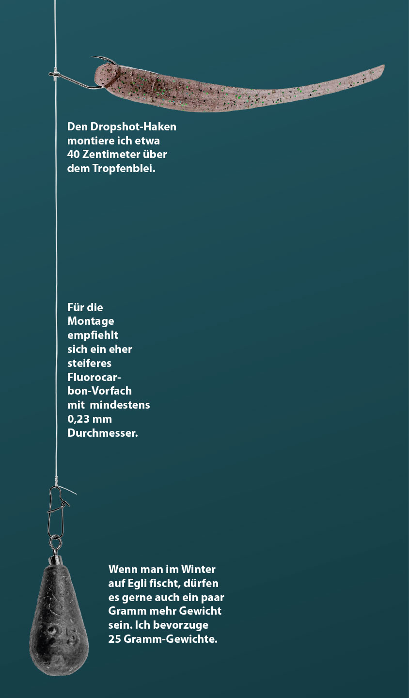Der Spätherbst ist eine der besten Zeiten für die Eglifischerei. Die Fische versammeln sich in tieferem Wasser und schlagen sich die Bäuche voll für den Winter. Zwar sind die Egli vom Ufer aus nicht mehr so einfach auszumachen, aber sie sind in Fresslaune. Jetzt ist das Dropshot-Rig meine erste Wahl, um die Fische zu finden und zu fangen.