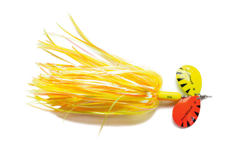 Grosse Spinner eignen sich eher für lichtere Krautfelder. Ein Fransenkranz um den Drilling verdeckt den Haken und dient ebenfalls als leichter Krautschutz. Rehhaar (Bucktail) hinter einem Spinner ist in Ordnung, allerdings wirkt künstliches Flash-Material lebendiger und bricht nicht so häufig wie die natürliche Variante. Ich bevorzuge sogenannte «Bulger», die mit zwei Spinnerblättern an einem Köder ausgestattet sind und eine Rute stark unter Druck setzen. Manche Modelle haben so grosse Spinnerblätter, dass der Druck sogar mein Boot bewegt. Einige Spinner sind ausserdem mit Rasseln ausgestattet – totale Krawallmaschinen!