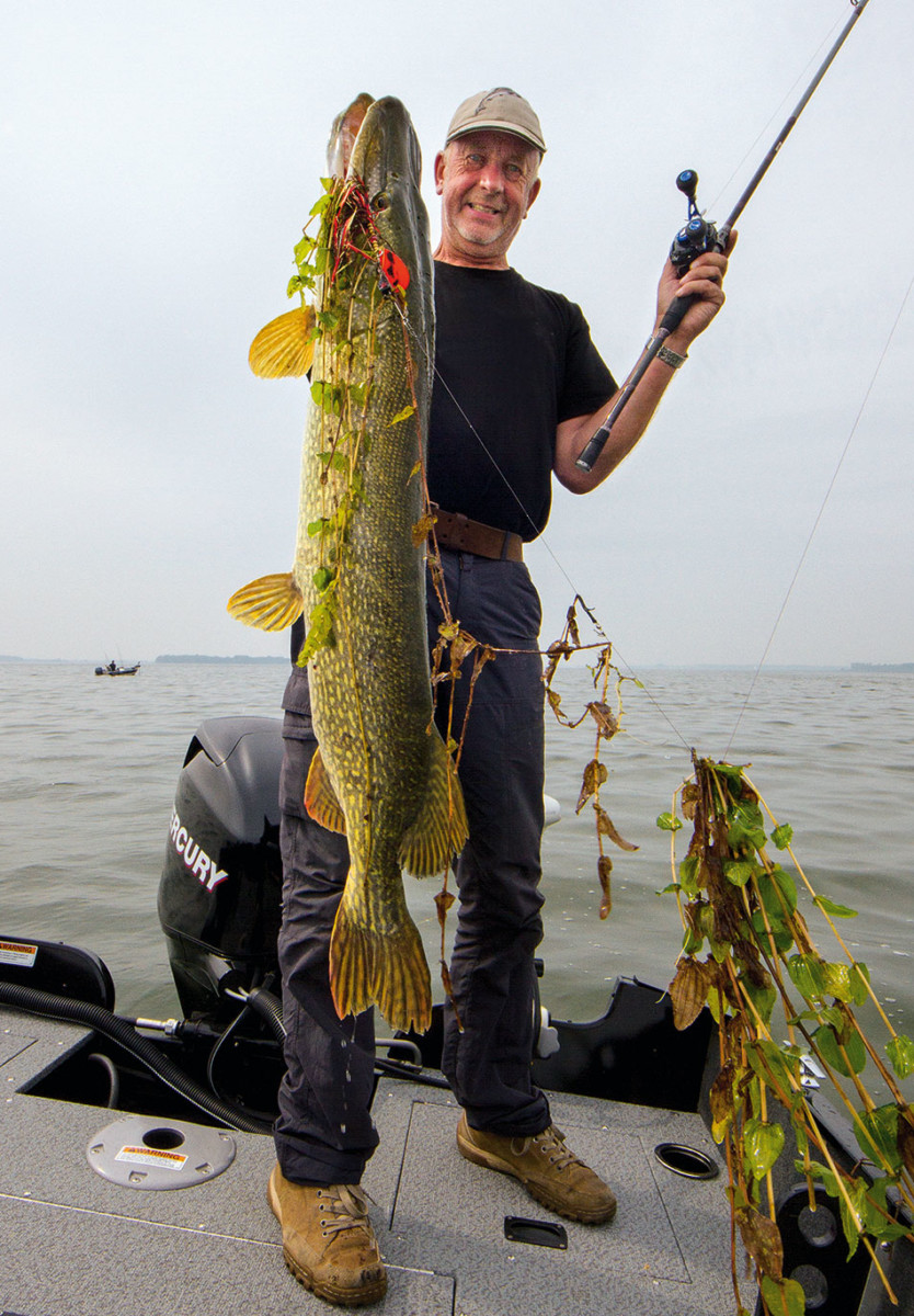 Im Kraut solltest Du die Rutenspitze nicht rechtwinklig zum Köder halten, denn wenn sich der Spinnerbait im Kraut verfängt, wirkt die Spitze wie ein Gummiband. Löst sich der Spinnerbait aus dem Gemüse, zieht ihn die zurückschnellende Spitze sofort ins nächste Hindernis. Darum mache ich es etwas anders: Ich richte die Spitze möglichst in einer Flucht zum Köder. Im Falle eines Hängers ziehe ich die Rute gerade nach hinten – löst sich der Spinnerbait, kurble ich ganz langsam weiter. Dadurch schnellt er nicht sofort in die nächste Krautfahne. Dichtes Kraut zu befischen ist immer schwierig, aber es lohnt sich. Mitten im Gemüse habe ich einige meiner grössten Hechte fangen können.