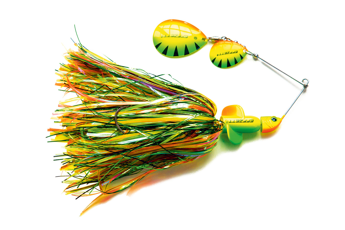 Grosse Spinner eignen sich eher für lichtere Krautfelder. Ein Fransenkranz um den Drilling verdeckt den Haken und dient ebenfalls als leichter Krautschutz. Rehhaar (Bucktail) hinter einem Spinner ist in Ordnung, allerdings wirkt künstliches Flash-Material lebendiger und bricht nicht so häufig wie die natürliche Variante. Ich bevorzuge sogenannte «Bulger», die mit zwei Spinnerblättern an einem Köder ausgestattet sind und eine Rute stark unter Druck setzen. Manche Modelle haben so grosse Spinnerblätter, dass der Druck sogar mein Boot bewegt. Einige Spinner sind ausserdem mit Rasseln ausgestattet – totale Krawallmaschinen!