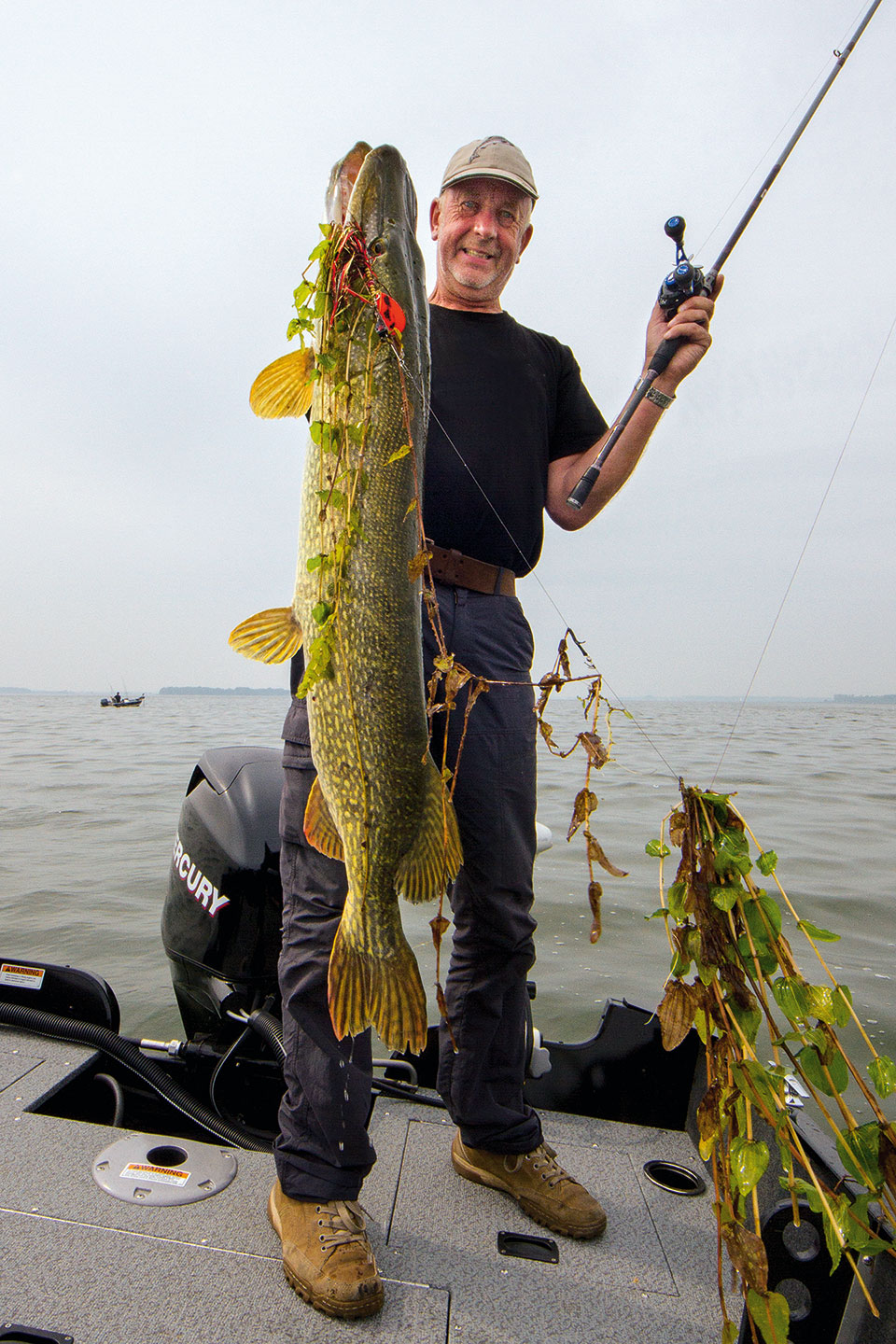 Im Kraut solltest Du die Rutenspitze nicht rechtwinklig zum Köder halten, denn wenn sich der Spinnerbait im Kraut verfängt, wirkt die Spitze wie ein Gummiband. Löst sich der Spinnerbait aus dem Gemüse, zieht ihn die zurückschnellende Spitze sofort ins nächste Hindernis. Darum mache ich es etwas anders: Ich richte die Spitze möglichst in einer Flucht zum Köder. Im Falle eines Hängers ziehe ich die Rute gerade nach hinten – löst sich der Spinnerbait, kurble ich ganz langsam weiter. Dadurch schnellt er nicht sofort in die nächste Krautfahne. Dichtes Kraut zu befischen ist immer schwierig, aber es lohnt sich. Mitten im Gemüse habe ich einige meiner grössten Hechte fangen können.