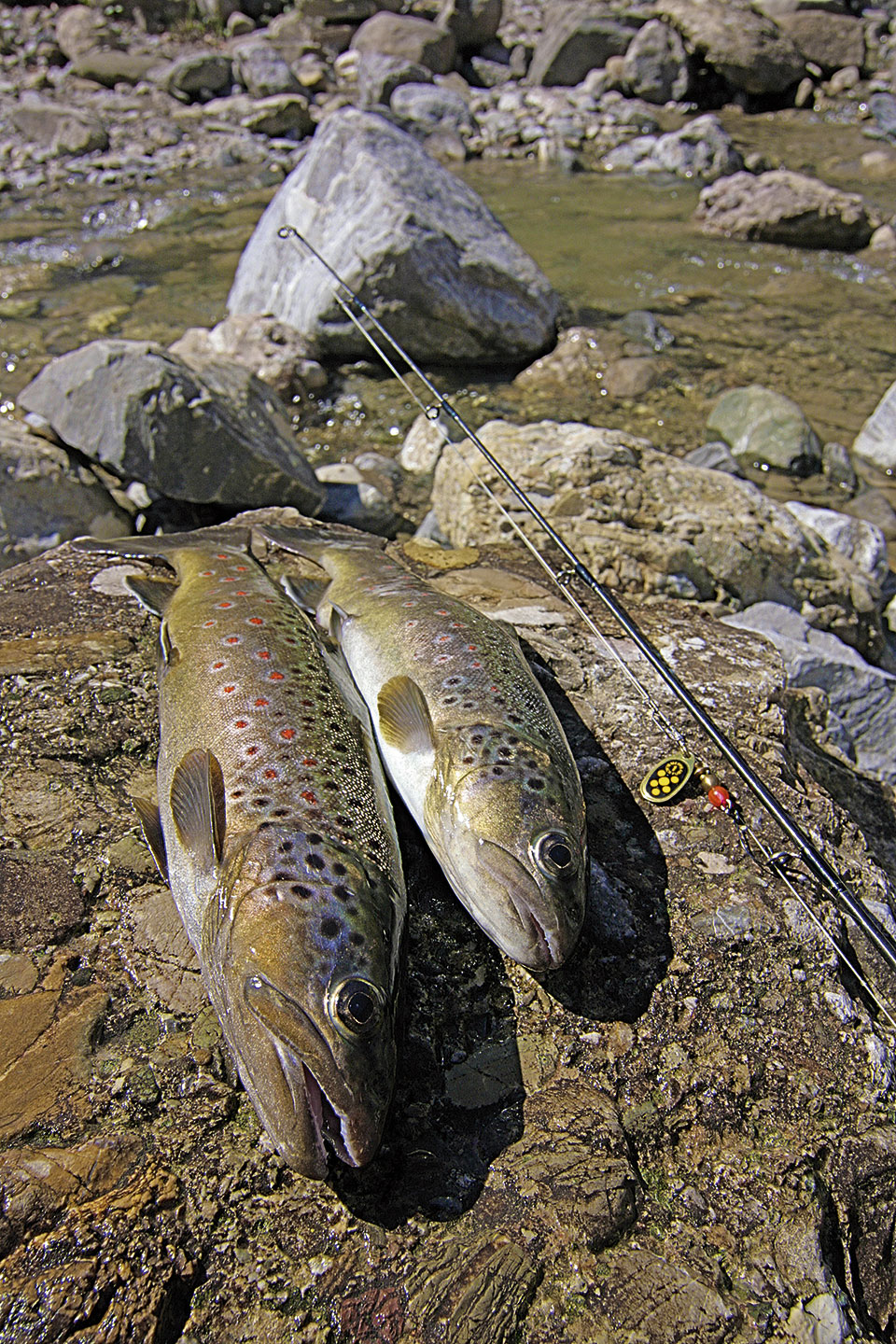 Spinner gehören seit bald 200 Jahren zum stetig wachsenden Arsenal der Forellenfischer und ihre fängigen Reize sind bis heute einen Versuch wert, gerade zum Beginn der Saison. Die intensiven Vibrationen und das auffällige Flirren und Glitzern des rotierenden Metallblatts sind starke Signale, die jede halbwegs gesunde Forelle im Gewässer jagdlustig, neugierig oder aggressiv macht. Einige, manchmal auch erfreulich viele dieser Fische gehen bis zum Äussersten und packen das unnatürliche, aber scheinbar unwiderstehliche Ding. Längst nicht alle Forellen, die den Köder attackieren, werden gehakt. Manche befreien sich im Drill, Untermassige bekommen selbstverständlich ihre Freiheit wieder und damit die Gelegenheit von ihrem Irrtum zu lernen. Der starke Reiz verliert deshalb zwangsläufig seine Wirksamkeit. Wird er zu oft eingesetzt, riskiert man sogar die Fische – insbesondere die Grossen – zu warnen und zu vergrämen.