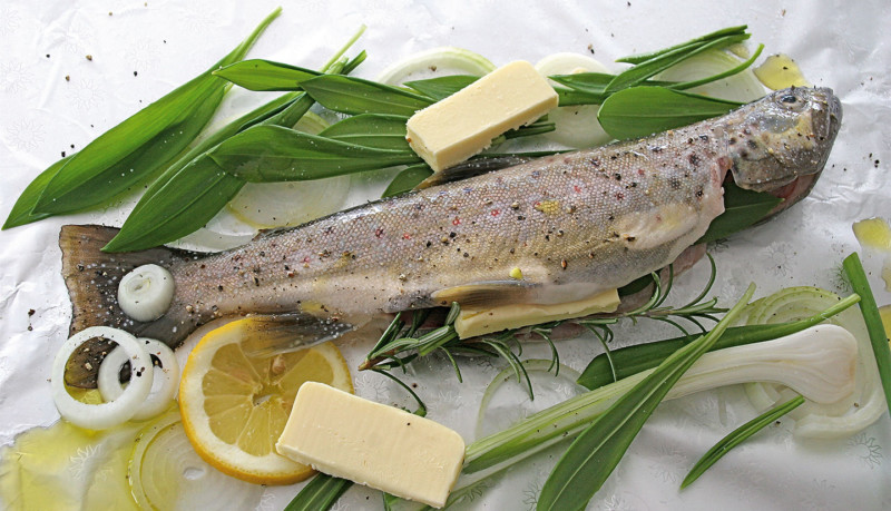 Am intensivsten kommen die Aromen von Fisch und Wildkräutern zur Geltung, wenn man sie zusammen luftdicht einpackt und gart. Ideal sind dafür Forellen von 200 bis 600 Gramm (25 bis 40 cm). Den Fisch legt man auf ein Stück Alufolie, das gross genug ist, um rundherum ein Päckchen zu falten. Vorher füllt man den Bauch der Forelle grosszügig mit Butter und einer Mischung aus fein geschnittenen Wildkräutern wie Bärlauch (Blätter oder Knospen), Sauerampfer, Gundelrebe, Schafgarbe, Taubnessel, Feldthymian usw. Fehlt der Bärlauch, empfiehlt es sich, die Mischung mit fein gehackten Frühlingszwiebeln oder Schalotten anzureichern. Die Forelle wird innen und aussen gesalzen, gepfeffert und mit einem «Gutsch» Weisswein aromatisiert. Dann wird das Päckchen sorgfältig verschlossen und im Ofen bei 200° (Umluft 180°) je nach Grösse des Fischs etwa 20 bis 30 Minuten gegart. Die Forellen sind perfekt, sobald sich die Flossen leicht aus dem Fleisch ziehen lassen.