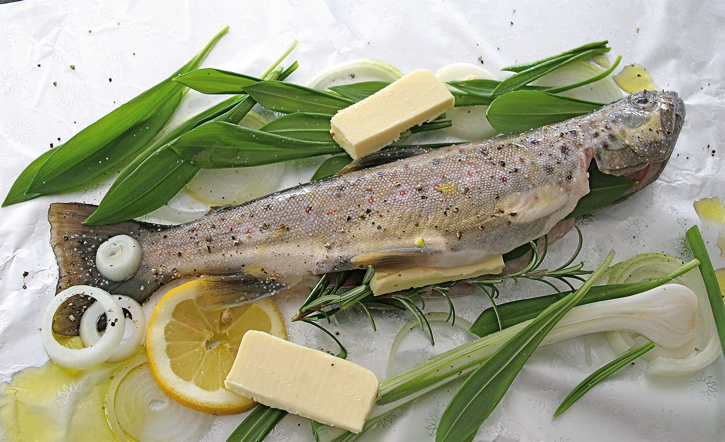 Am intensivsten kommen die Aromen von Fisch und Wildkräutern zur Geltung, wenn man sie zusammen luftdicht einpackt und gart. Ideal sind dafür Forellen von 200 bis 600 Gramm (25 bis 40 cm). Den Fisch legt man auf ein Stück Alufolie, das gross genug ist, um rundherum ein Päckchen zu falten. Vorher füllt man den Bauch der Forelle grosszügig mit Butter und einer Mischung aus fein geschnittenen Wildkräutern wie Bärlauch (Blätter oder Knospen), Sauerampfer, Gundelrebe, Schafgarbe, Taubnessel, Feldthymian usw. Fehlt der Bärlauch, empfiehlt es sich, die Mischung mit fein gehackten Frühlingszwiebeln oder Schalotten anzureichern. Die Forelle wird innen und aussen gesalzen, gepfeffert und mit einem «Gutsch» Weisswein aromatisiert. Dann wird das Päckchen sorgfältig verschlossen und im Ofen bei 200° (Umluft 180°) je nach Grösse des Fischs etwa 20 bis 30 Minuten gegart. Die Forellen sind perfekt, sobald sich die Flossen leicht aus dem Fleisch ziehen lassen.