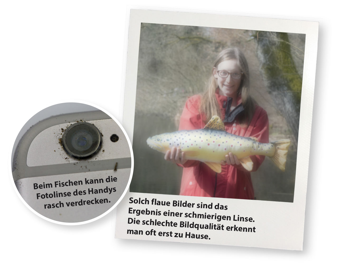 Beim Fischen kommt es schnell vor, dass die Linse verschmutzt ist. Beim Fotografieren im grellen Sonnenlicht sieht man das auf dem Display noch nicht, aber zu Hause musst du dann feststellen, dass die Bilder schwammig aussehen. Prüfe vor dem Fang die Linse und reibe sie gegebenenfalls mit einem trockenen, fusselfreien Tuch sauber. Keinesfalls mit den Fingern den Staub wegzuwischen versuchen, du machst es so nur schlimmer!