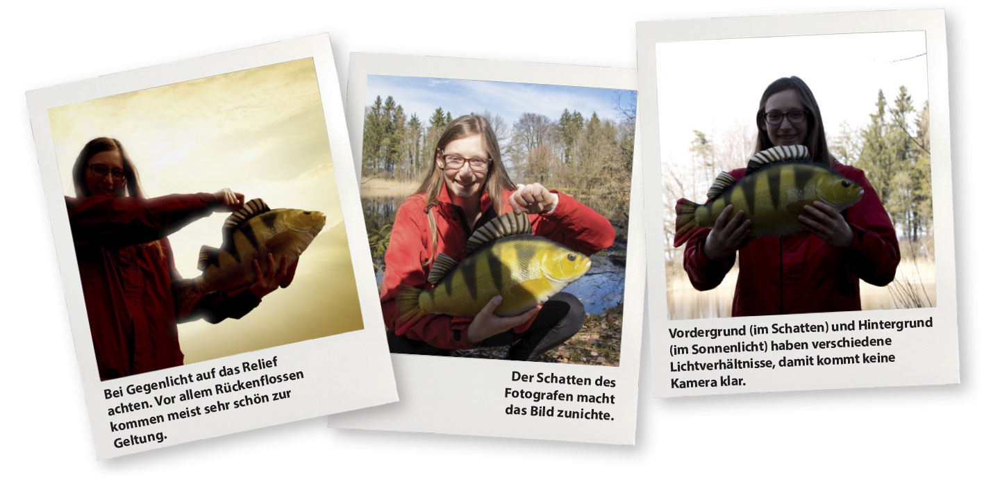 Oft steht der Fänger auf Fangbildern im Schatten eines Baums, während im Hintergrund die Sonne auf den See scheint. Egal, woher das Sonnenlicht kommt, der Effekt ist ähnlich wie bei der Gegenlicht-Fotografie: Hintergrund optimal abgebildet, Hauptmotiv dunkel. Wie lässt sich dies verhindern? Entweder der Foto-Hintergrund befindet sich ebenfalls im Schatten, oder aber der Fänger tritt mit seinem Fisch ins Sonnenlicht. Der Hintergrund sollte nie stärker beleuchtet sein als das Hauptmotiv!