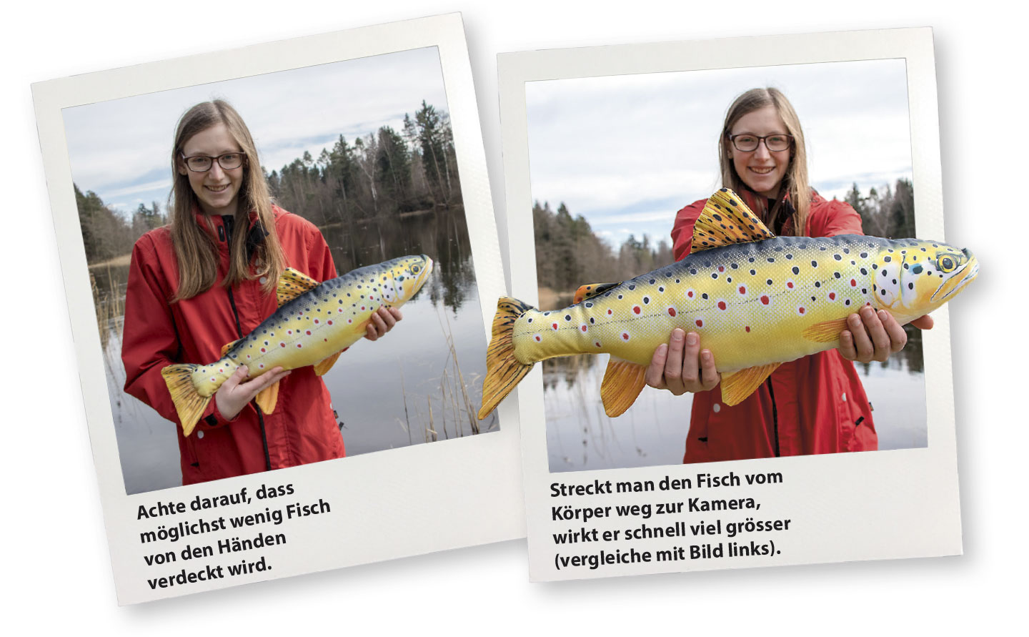 Es braucht etwas Übung, einen Fisch richtig in die Kamera zu halten. Achte vor allem darauf, dass du mit deinen Händen möglichst wenig Fisch verdeckst. Ausserdem kannst du deinen Fang noch etwas imposanter wirken lassen, wenn du ihn weiter von dir weghältst (siehe Beispiel). Die meisten einfacheren Kameras, wie sie beispielsweise in Smartphones zum Einsatz kommen, haben Weitwinkellinsen, die diesen Vergrösserungseffekt verstärken.
