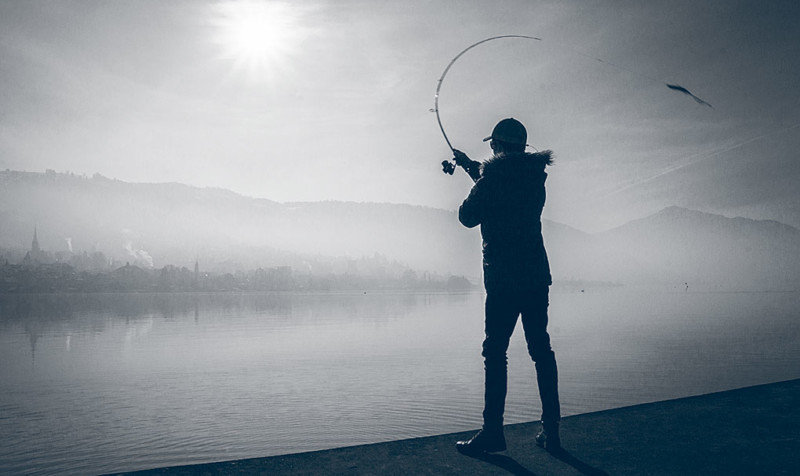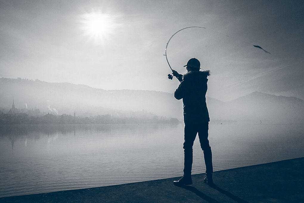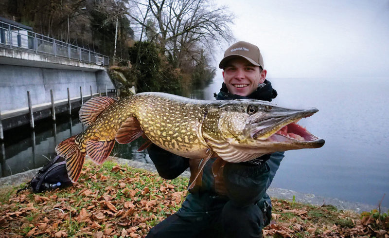 Im Winter ist das Wasser klarer und mit mehr Sauerstoff versorgt. Somit gelangt auch mehr Licht in die Tiefe der Seen. Bei diesen Bedingungen vertraue ich natürlichen Farben wie Silber, Dunkelgrün, Blau oder Beige. Grellere Farben wie Hellgrün, Neongelb oder die Farbkombination «Firetiger» kommen eher im trüben Wasser zum Einsatz. Die Farbe ist jedoch eher zweitrangig, wesentlich wichtiger ist die Führung der Köder: Nicht nur häufiges Stoppen und langsames Einkurbeln erhöhen jetzt die Bisschancen. Auch die Technik «Faulenzen» lässt sich besonders gut auf tiefer liegendem Gewässergrund anwenden. Hierzu lässt man den Köder auf Grund sinken und kurbelt ihn dann mittels ein bis zwei Kurbelumdrehungen hoch, um ihn abermals an den Grund gleiten zu lassen. Die Rute bleibt dabei stets in der gleichen Position. So attackieren die Hechte den zum Grund taumelnden Gummifisch fast ausschliesslich in der Absinkphase. Dieselbe Technik lässt sich auch im Mittelwasser anwenden. Die Anhebe- und Absinkbewegung imitiert auch hier einen sterbenden Fisch, der eine leicht zu erjagende Beute darstellt.