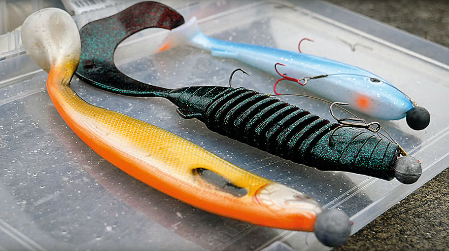 Mit Gummifischen lassen sich grosse, verletzte Beutefische besonders gut imitieren. Auch bei niedriger Einzugsgeschwindigkeit bewegen sie sich verführerisch und sind generell vielseitig einsetzbar. Ich setze oft auf grosse Twister und weiche Gummifische, welche beispielsweise Marken wie Daiwa, Westin oder Abu Garcia in ihrem Sortiment führen. Meine Lieblingsköder weisen Längen von 16 bis 25 cm auf. Die richtige Bebleiung ist ebenfalls ausschlaggebend. Man sollte nicht zu schwere Bleiköpfe montieren, da sich ansonsten die reizende Absinkphase deutlich verkürzen würde. Jedoch gibt es anderseits Nachteile, wenn zu wenig Blei am Köder angebracht wird, da man damit nur schwer die gewünschte Tiefe erreichen kann. Ich wähle für meine Gummifische prinzipiell Bleiköpfe zwischen 20 bis 40 Gramm, so werfe ich schliesslich immer noch gegen die 150 Gramm durch die Gegend. Um die schweren Köder mühelos werfen zu können, empfehle ich eine Rute mit einer minimalen Länge von 240 cm und einem Wurfgewicht von 60 bis 150 Gramm. Passend zur Rute ist bei mir eine Rolle in der 4000er-Grösse im Einsatz. Ich verwende eine Stationärrolle, um auch mit feinen Handschuhen uneingeschränkt werfen zu können. Bei Minustemperaturen kann es schon mal vorkommen, dass die feinen Fasern der geflochtenen Schnur einfrieren und sie reisst. Bei sehr kalten Verhältnissen weiche ich auf monofile Schnur aus, da diese weniger heikel auf vereiste Ringe reagiert und selber nicht einfrieren kann. Ein starkes, hechtsicheres Vorfach ist natürlich das ganze Jahr über Pflicht.