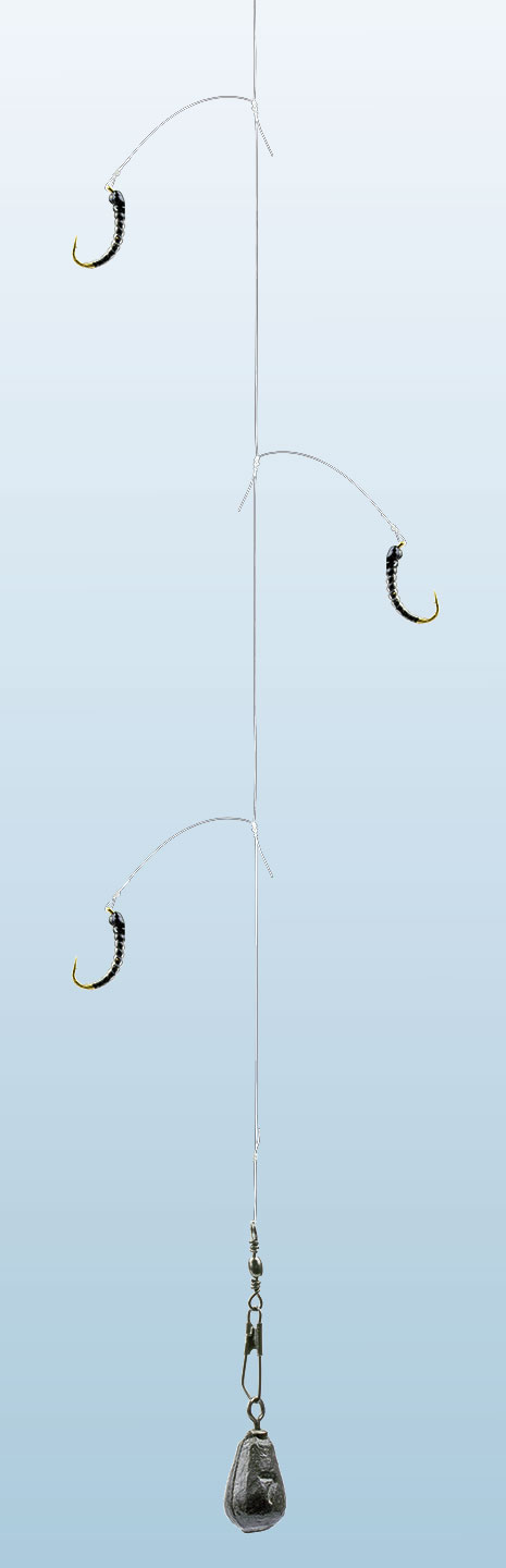 Ist mit schlammigem und weitgehend ebenem Grund zu rechnen, wie dies auf den meisten sogenannten Felchenböden der Fall ist, können alternative Modelle eine deutlich höhere Bissfrequenz bewirken. So fischt «Felchenguru» vorwiegend mit dem sogenannten Nachläufermodell, bei welchem das Blei zwischen der vierten und der untersten Nymphe angebracht ist. Hier liegt die letzte Nymphe immer auf dem Gewässerboden auf. Damit diese von den Felchen überhaupt wahrgenommen wird, braucht es eine ein wenig aktivere Führung.