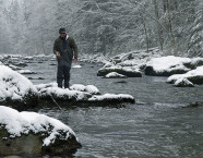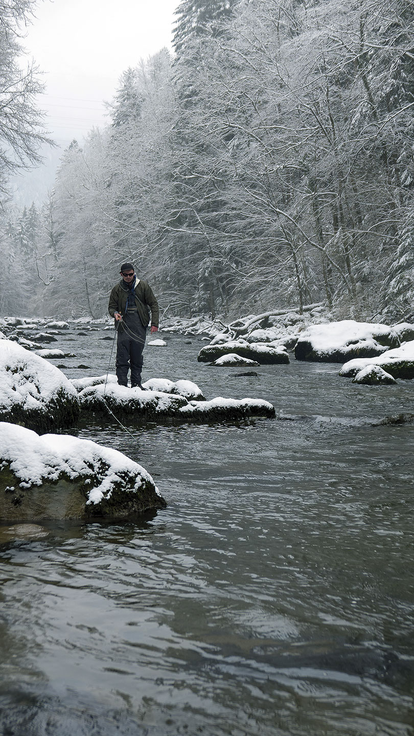 Der Blick auf die verschneite Flusslandschaft entschädigt uns für das frühe Aufstehen und die vergessenen langen Unterhosen. Bewaffnet mit der Winter-Steelhead-Ausrüstung wollen wir an diesem ersten März auf die Spatzen kanonieren. Die Streamer müssen bei solchen Bedingungen ganz zum Grund und solche Geschosse lassen sich mit einer fünfer Forellenrute nicht zum Fliegen bringen.