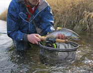 Topmotiviert und noch etwas beharrlicher als zuvor fischen wir weiter. Unterwegs begegnen wir einem Fischerkollegen. Er ist mit dem toten Fischli unterwegs an die obere Reviergrenze und einer der Wenigen, die heute überhaupt am Wasser sind. Drei Stunden später treffen wir ihn bei der Fischzucht in der Reviermitte. Er hat drei Eröffnungsforellen gefangen und seine heisse Suppe schon gelöffelt. Auch wir können noch je eine kleinere Regenbogenforelle überzeugen. Die in der Sihl vereinzelt vorkommenden Regenbögler fressen auch bei sehr tiefen Wassertemperaturen und werden während der ersten Wochen häufiger gefangen als die winterträgen Bachforellen.