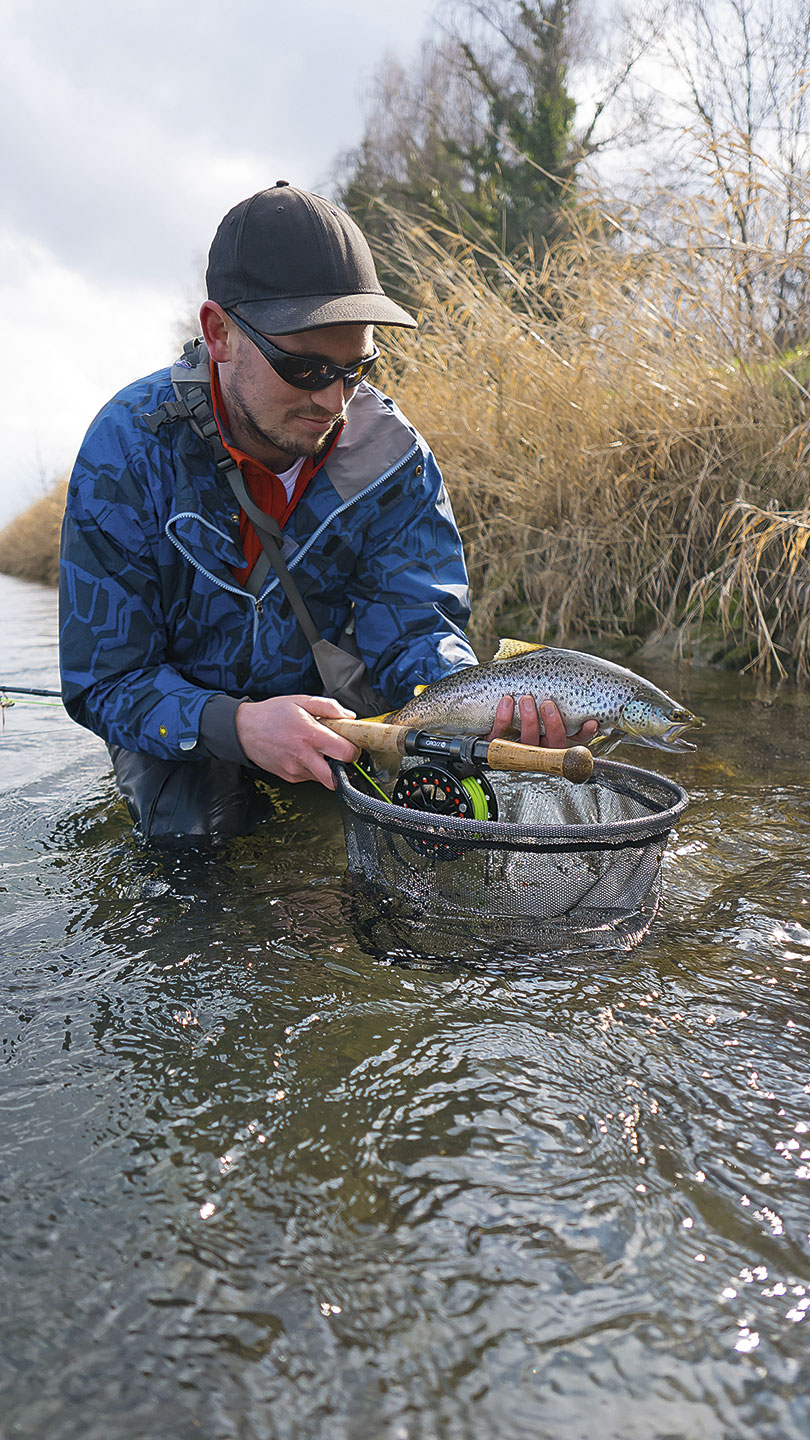Die erste Stunde verläuft ruhig und liefert wenig Grund zur Hoffnung. Wenn man zu dieser Jahreszeit durch die Sihl watet, glaubt man sich in einem fischleeren Gewässer. Der Fluss hat hier, an der Kantonsgrenze Zürich-Zug, aber einen ausgezeichneten Forellenbestand. In vier Wochen fangen selbst Anfänger Fisch auf Fisch. Unter jeden Stein lassen wir unsere Streamer swingen. Regelmässige Hänger zeigen uns, dass wir auf dem richtigen Weg sind – oder zumindest in der richtigen Etage. Kurz nach acht Uhr ruckt es dann endlich in der Schnurhand. Wenig später gleitet die erste Bachforelle des Jahres über den Feumerrand.