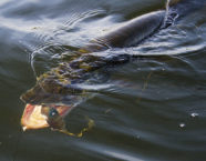 Zu dieser Zeit fische ich besonders gerne in Grundnähe. Das bedeutet, dass ich mit sinkenden Jerkbaits fische. Sie dürfen aber nicht allzu gross sein, weil es nun nur so von Kleinfischen wimmelt. Wenn ich flach fische, führe ich den Köder nicht mit Abwärtsschlägen der Rute, sondern jerke ihn mit Schlägen nach oben. So führe ich selbst einen sinkenden Jerkbait so hoch wie nötig an der Oberfläche. Natürlich funktionieren auch Wobbler, aber für mich haben sie eine zu starke Kippaktion. Ich bevorzuge Flanker mit einer kleinen Lippe. Mit ihnen kann man sehr gut twitchen – was ich wirklich gerne mache. Vielleicht twitche ich etwas anders als andere Fischer: Nach dem Auswerfen bringe ich meinen Wobbler sofort mit zwei bis drei kurzen, harten Schlägen auf Tiefe. Dann führe ich ihn drei bis vier Meter gleichmässig ruhig zurück, ehe ich ihn wieder mit zwei bis drei kräftigen, recht kurzen Schlägen animiere. Gleich darauf lege ich eine kurze Pause ein, sodass der Köder in Richtung Oberfläche aufsteigen kann. Aber bevor er überhaupt in Oberflächennähe kommt, kurble ich ihn weiter ein und fische wieder in drei bis vier Meter Tiefe mit Tempo weiter. Bei einem normalen Wurf kann ich den Köder auf diese Weise etwa drei bis vier Mal beschleunigen.