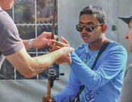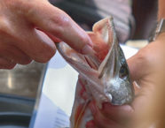 Bevor die neun anwesenden Boote ihre Gäste auf den Zürichsee tragen können, gibts eine Einführung in die Fischerei durch den SaNa-Instruktor Beat Ludwig, wo einerseits die Fanggeräte, andererseits die verschiedenen Fischarten, auf Tabletten liegend, präsentiert werden. Es ist total faszinierend mitzuerleben, wie blinde Menschen mit ihren Fingern «sehen», wie sie die verschiedenen Angeln und auch die Fische höchst konzentriert systematisch abtasten und so regelrecht spürbar ist, wie ein Bild im Kopf entsteht.