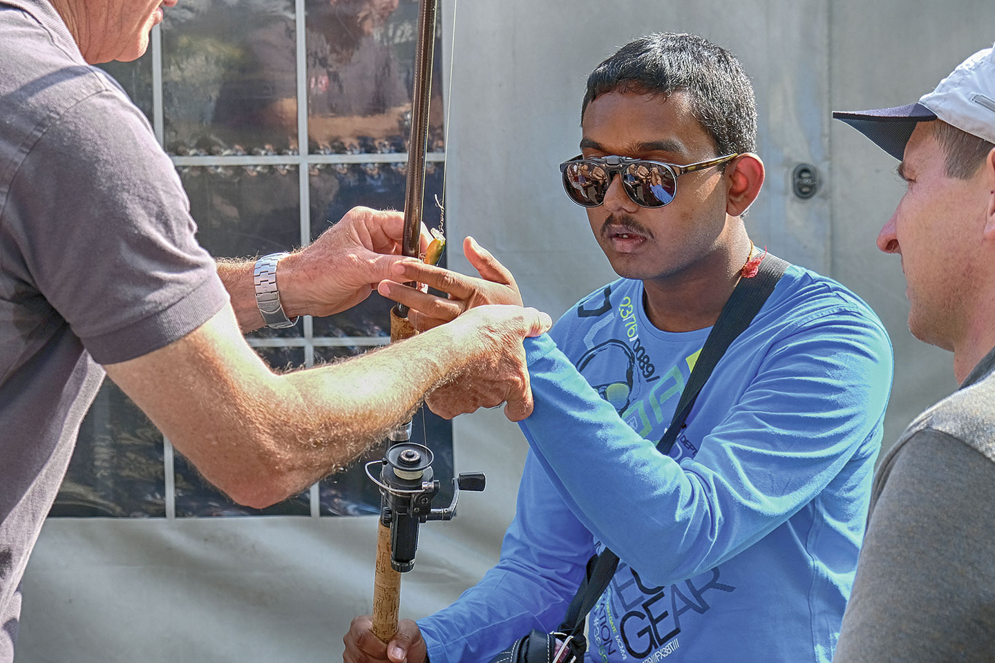Am «Schweizerischen Tag der Fischerei», ists dann endlich so weit: «Fischen mit Handicap» ist Realität. Urs Lüscher vom Blinden- und Sehbehindertenverband Sektion Zürich-Schaffhausen instruiert an diesem Morgen als erstes die Helferinnen und Helfer, die bereits eine Stunde vor dem eigentlichen Anlass da sind. Und ruft ihnen ins Gedächtnis, dass man bei einem blinden Menschen mit «hier» oder «dort» – generell undefinierten Ortsangaben – nicht wirklich weit kommt. Dass man sich vollkommen auf die verbale Kommunikation konzentriert und die Nonverbale ausblendet. Auch solle man nicht jedes Wort auf die Goldwaage legen, sondern so reden, wie einem «der Schnabel gewachsen» sei – so seien Sprüche wie beispielsweise «man sieht sich» oder «lueg aa» auch bei Blinden gebräuchlich.