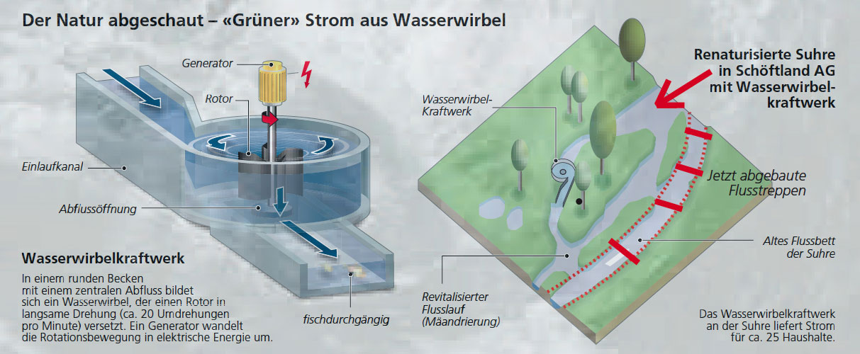 Die vom Bundesamt für Umwelt (BAFU) für die Fliessgewässer definierten Entwicklungsziele «ausreichender Gewässerraum» und «ausreichende Wasserführung» wird durch das Projekt an der Suhre bestens erfüllt, da die Wasserführung nicht verändert wird und die gleichzeitige Renaturierung und Revitalisierung zum Projekt gehörte. Ein zentrales Ziel der Wirbelkraftwerktechnologie ist die Fischdurchlässigkeit.