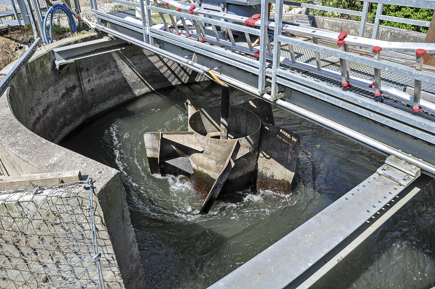Norbert Schmid, engagiertes Vorstandsmitglied der Betreibergenossenschaft, zeigt und erläutert mir die Anlage mit Begeisterung. Gemächlich dreht der Rotor bereits seit 2009 seine Runden – und liefert Strom für etwa 25 Haushalte. Bei 20 Umdrehungen pro Minute kommen die Fische problemlos an ihm vorbei – und zwar hinauf und hinunter. Ja, sie werden quicklebendig, denn sie kommen durch den Wirbel in den Genuss einer Sauerstoffanreicherung sowie einer Wasserabkühlung.
