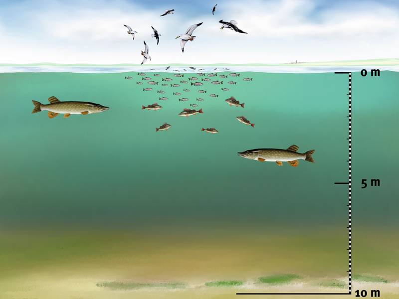 Sicher, die grösseren Hechte eines Gewässers sind auch in anderen Bereichen zu finden. Im Sommer zum Beispiel in der Nähe der Sprungschicht, dem Übergang vom warmen zum kalten Wasser, und auch in Bereichen, die nur wenige Meter tief sind. Aber sie scheinen teilweise auch dort unterwegs zu sein, wo man sie am allerwenigsten vermuten würde – zum Beispiel über tiefem Wasser wenige Meter unter der Oberfläche.