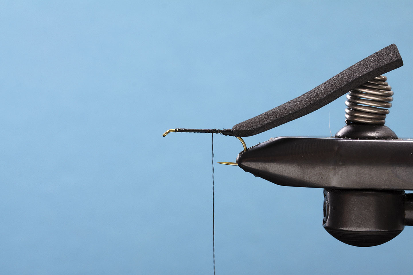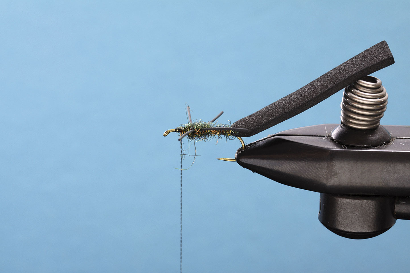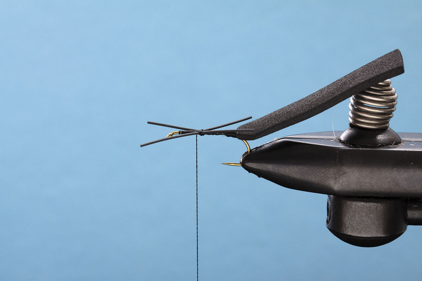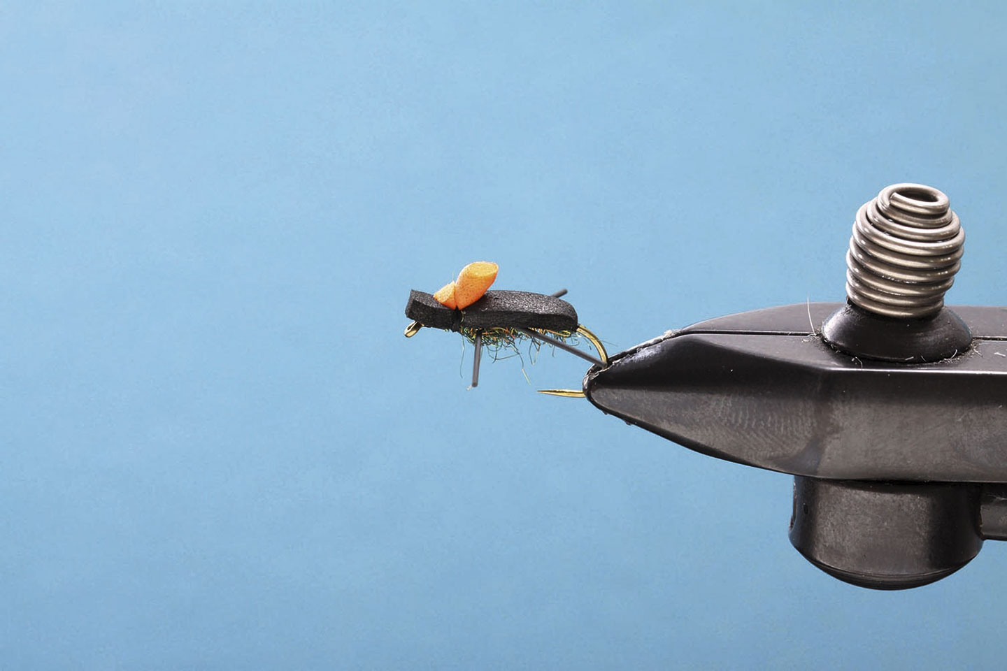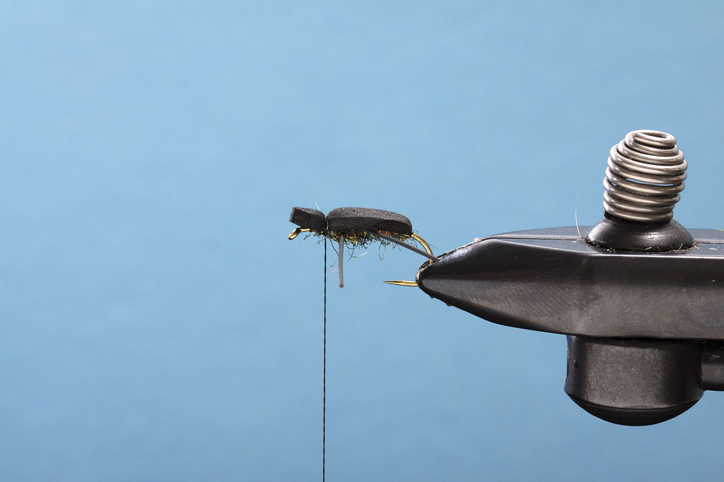 Ein wichtiger Bestandteil unseres Käfers ist der Foam-Rücken. Dieser gibt der Fliege das typische Aussehen und lässt sie ausgezeichnet schwimmen. Mit dem Feuerzeug erhitzen wir den Foam, um die Kanten zu glätten und ein realistischeres Aussehen zu erreichen. Das Ice Dub in der Farbe Peacock gibt dieser Fliege den nötigen Glanz. Die Gummibeine sind ein wahrer Fischmagnet, sie zappeln und bewegen sich verführerisch. Dank des orangen Foam-Zylinders sieht man die Foamy auch unter schwierigen Lichtverhältnissen bestens.