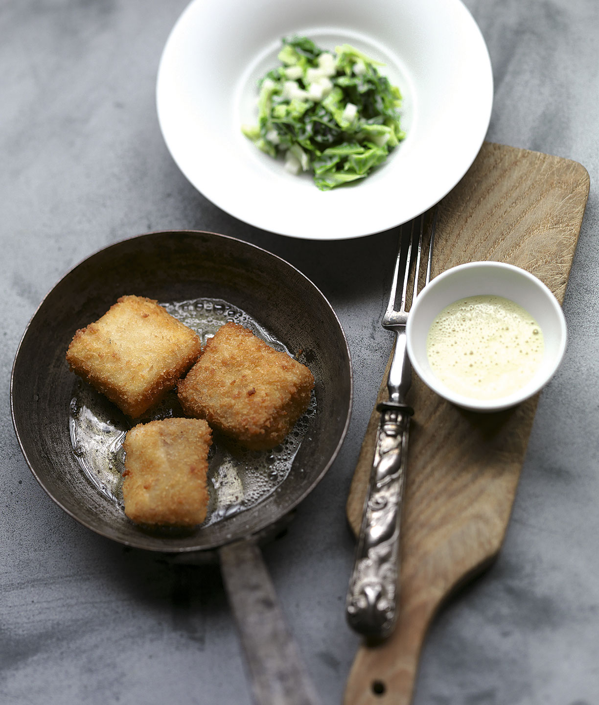Gebackener Wels mit Apfel-Wirsing und Traubenkernsenfsauce