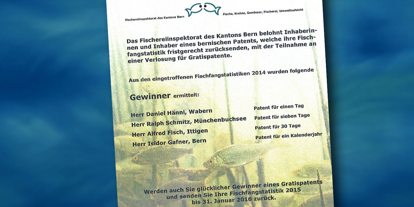 Das Fischereiinspektorat des Kantons Bern belohnt Inhaberinnen und Inhaber eines Patents, welche ihre Fischfangstatistik fristgerecht zurücksenden. All diese nehmen an einer Verlosung für Gratispatente teil.