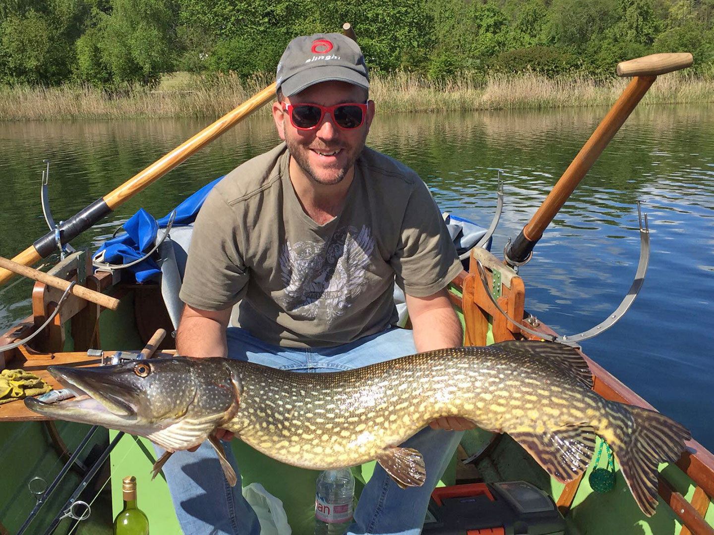 Am frühen Morgen des 5. Mai, bei sonnigen 20 Grad und klarem Wasser, stachen André Merki aus Niederglatt und Mike Bühler mit dem Ruderboot in See. Schon beim Herauslassen der vierten Rute gab es am ersten Seehund einen Ruck und nach wenigen Minuten konnte ein Hecht von 104 Zentimeter gelandet werden. Der rund 20 cm grosse Köder war gänzlich im Maul verschwunden. Nach einem weiteren Biss eines kleineren Hechts, der sich kurz vor dem Feumern verabschiedetet, bog sich um 10.45 Uhr eine weitere Rute, ebenfalls am Seehund. Nach knapp zehn Minuten konnte André Merki nach grossem Widerstand des kämpferischen Hechts seine persönliche Bestmarke knacken. Verwendetes Gerät: Shimano-Rute, Shimano-Multirolle, 0,35er-Monofil, Stahlvorfach, Savage Gear Gummifisch-Forelle in braun.