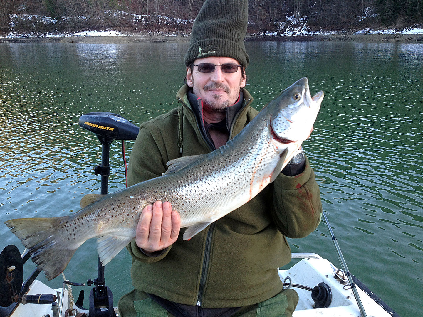 «Bei schönstem Sonnenschein fuhren mein Freund Jack und ich am 26. Januar zum Bootsfischen mit Schleppruten auf den Greyerzersee hinaus, um den Seeforellen nachzustellen», berichtet Guido Betschart aus Freiburg. Um 16 Uhr, nach drei Stunden Schleppen, kam der ersehnte Biss. Sofort nahm er seine Rute in die Hand und fing an zu kurbeln, bis er den Fisch so richtig in der Rute spüren konnte. Sogleich schoss die Forelle wild aus dem Wasser und verschwand auch gleich wieder in der Tiefe. Nach vielen abgezogenen Metern Schnur und einem zehnminütigem Kampf tauchte sie vor dem Boot auf und musste sich gleich danach im Feumer geschlagen geben. Welch schöner Anblick, welche Freude! Verwendetes Gerät: Shakespeare President-Rute 2,4 m, Mitchell 300-Rolle, 0,30er-Spiderwire Geflochtene, 0,57er Orvis Mirage-Vorfach, hellbraune Perlmutterspange.