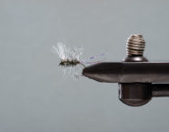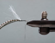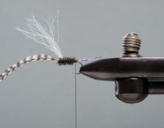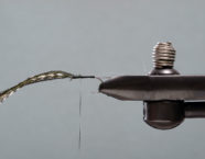 Die Griffith’s Gnat ist relativ einfach zu binden. Zuerst binden wir das Schwänzchen aus Mirage Tinsel ein. Dann binden wir die Hechel und das Pfauengras nach vorne abstehend ein. Anschliessend machen wir die Sichthilfe und winden dann das Pfauengras nach hinten und sichern es mit zwei Wicklungen. Dann wird die Hechel nach hinten gewunden und gesichert, indem der Bindefaden durch die Hechel nach vorne geführt wird. Dank diesem Schritt wird die Fliege um einiges haltbarer, die Hechel und das fragile Pfauengras sind so gut stabilisiert.