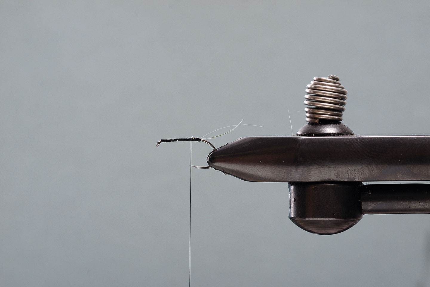 Die Griffith’s Gnat ist relativ einfach zu binden. Zuerst binden wir das Schwänzchen aus Mirage Tinsel ein. Dann binden wir die Hechel und das Pfauengras nach vorne abstehend ein. Anschliessend machen wir die Sichthilfe und winden dann das Pfauengras nach hinten und sichern es mit zwei Wicklungen. Dann wird die Hechel nach hinten gewunden und gesichert, indem der Bindefaden durch die Hechel nach vorne geführt wird. Dank diesem Schritt wird die Fliege um einiges haltbarer, die Hechel und das fragile Pfauengras sind so gut stabilisiert.