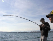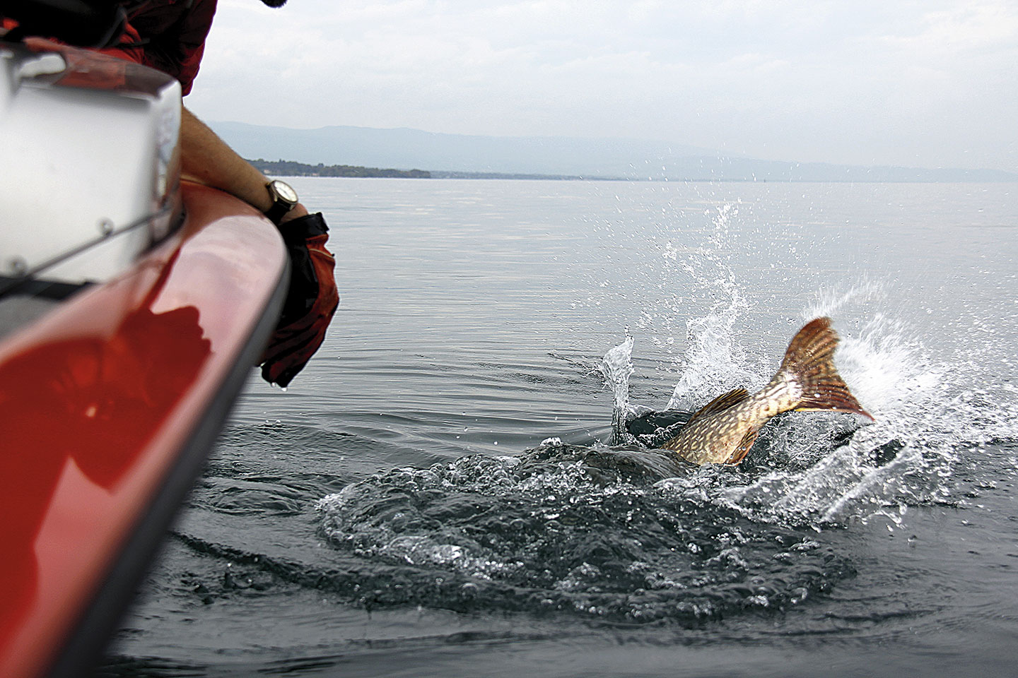 Den zweiten Tag begannen wir bei starken Windböen in Nyon im Kanton Waadt. Schon bald fingen wir einen 79 cm langen Hecht – unser grösster bis anhin. Auf der Suche nach kapitalen Fischen steuerten wir viele auf dem GPS-Gerät gespeicherte Punkte an. Der immer stärker werdende Wind schien die schlummernden Hechte zu wecken. Die hohen Wellen führten uns auch vor Augen, wie wichtig es ist ein geeignetes Boot zur Verfügung zu haben.