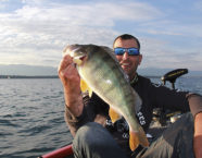 Es war ein herrlicher Morgen und wir befischten bei strahlendem Sonnenschein eine ungefähr zehn Meter tiefe, vielversprechende Stelle, an der wir grosse Hechte erwarteten. Wir freuten uns aber zuerst über einen grossen Egli, der als Beifang an den Haken ging, sonst blieb es aber relativ ruhig. Alles was wir hörten, waren die Paddelschläge einiger Kanufahrer.