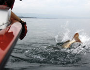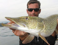 Wie am vorherigen Tag passierte vor 15 Uhr wenig. Dann jedoch hakte Christophe einen Meterhecht, der seinen Köder in 16 Metern Tiefe genommen hatte. Zuerst kam der Fisch praktisch widerstandslos zum Boot. Als er jedoch nur noch zwei Meter entfernt war, explodierte er plötzlich und schwamm wütend unter das Boot. Kurz darauf konnten wir den Fisch aber ins Boot heben. Der Fang erfreute uns und weitere Hechte um die 80 Zentimeter führten zu einer ausgezeichneten Stimmung an Bord.