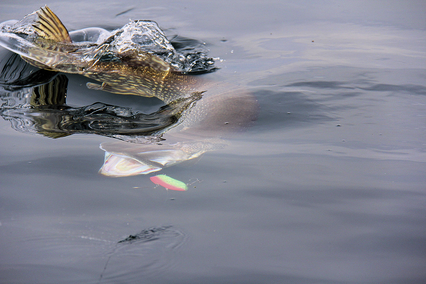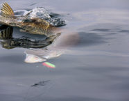 Deshalb fing Christoph damit an die Köder extrem langsam einzuholen. Der Taktikwechsel zeigte sofort Wirkung. Er bekam einen kräftigen Biss. Unglücklicherweise konnte sich der Monsterhecht vom Haken befreien und schickte uns nur den von Bisspuren gezeichneten Köder nach oben. Wir speicherten die Koordinaten und beschlossen diesen Spot am nächsten Tag nochmals aufzusuchen. Wir waren ziemlich ernüchtert, doch der nächste Tag sollte die Enttäuschung vergessen machen.
