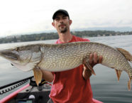 Wir fuhren zu einem abfallenden Plateau in der Nähe von Morges. Auf dem Echolot erkannten wir neben grossen Weissfisch-Schwärmen einige kapitale Signale, das waren unsere Hechte. Wir montierten grosse Köder auf 100 Gramm schwere Bleiköpfe und jiggten sie drei Meter über Grund. Dabei konnten wir ein paar schöne Hechte fangen. Im tiefen Wasser waren zwar auch wirklich riesige Hechte auszumachen, sie zu fangen gelang uns jedoch vorerst nicht. Unsere Köderpräsentation funktionierte bei den kapitalen Exemplaren scheinbar nicht.