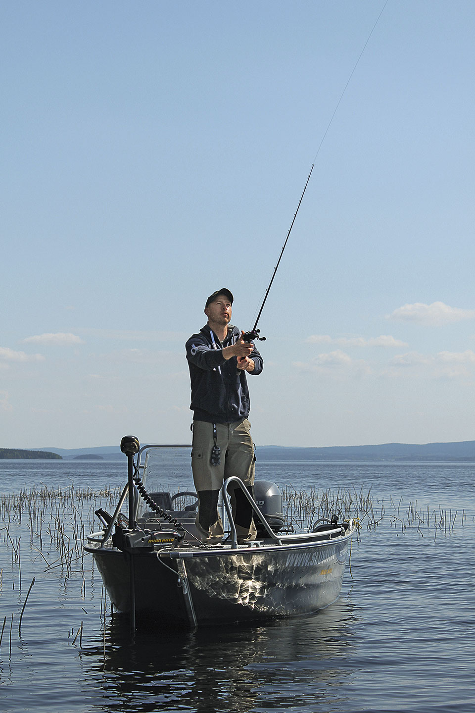 Eine zügige Köderführung geht immer mit einem konstanten, gleichbleibenden Einholen einher. Um auch mögliche Verfolger zum Anbeissen zu verführen, lege ich aber während einer solchen Einholphase hin und wieder eine kurze Kurbelpause ein. Aber nicht zu oft, maximal zwei Pausen pro Wurf. Besonders wenn das Wasser stetig wärmer wird, haben solche zügig und gleichmässig angebotenen Köder die Nase vorn. Im warmen Wasser sind sowohl Jäger als auch Gejagte putzmunter – was ihrem gesteigerten Stoffwechsel geschuldet ist. Die Jäger orientieren sich gezielt in Richtung Oberfläche und Freiwasserregion sowie der Krautbereiche, denn hier gibts Nahrung im Überfluss. Aber sie müssen schnell sein, wenn sie nicht leer ausgehen wollen. Ein solch aktives Schwimmverhalten bringt den Energiehaushalt der Fische nicht aus dem Gleichgewicht, da das Wasser warm ist und die Muskulatur keine zusätzliche Energie verbraucht.