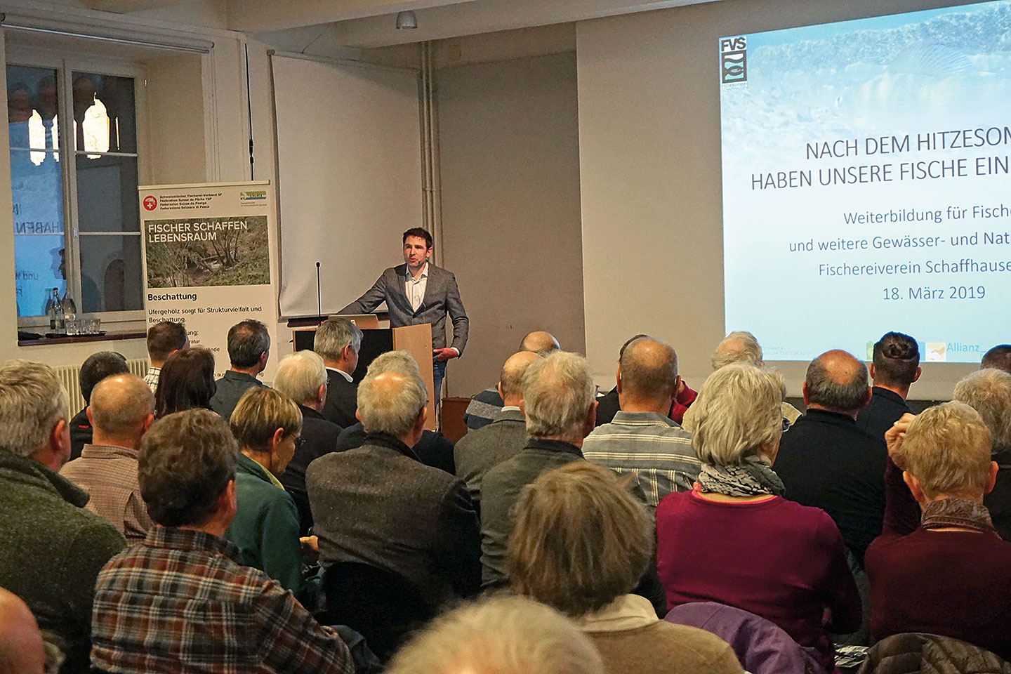 Am 18. März fand im prall gefüllten Vortragssaal des Museums Allerheiligen eine Informationsveranstaltung des FV Schaffhausen in Zusammenarbeit mit Vertretern des Kantons statt. Aufgegleist und moderiert wurde der Anlass von Samuel Gründler, Präsident des FV Schaffhausen und Vorstandsmitglied des Schweizerischen Fischereiverbands.