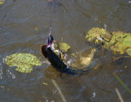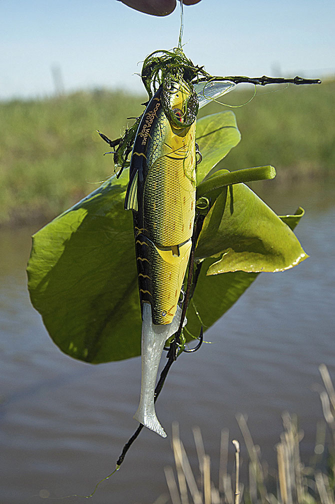 Zudem ist es ratsam, mit geflochtener Schnur mit einer Tragkraft von 50 lb oder mehr zu fischen. Die Geflochtene schneidet wesentlich besser durch die Pflanzen als zum Beispiel Nylon. Im Drill eines grossen Fischs kann das durchaus wichtig sein – vor allem dann, wenn der Fisch voll in die Pflanzen schwimmt. An die Geflechtschnur knote ich ein dickes Fluorocarbon-Vorfach, an dessen Ende dann mein Kunstköder eingehängt wird.