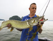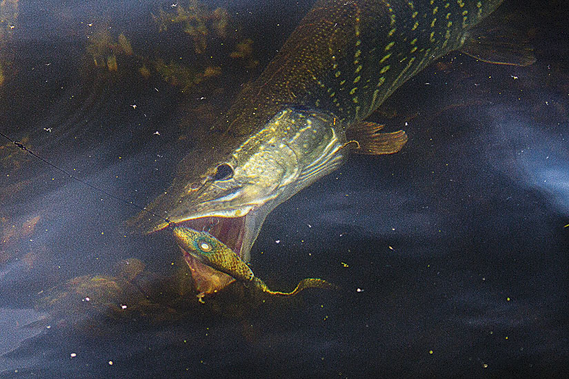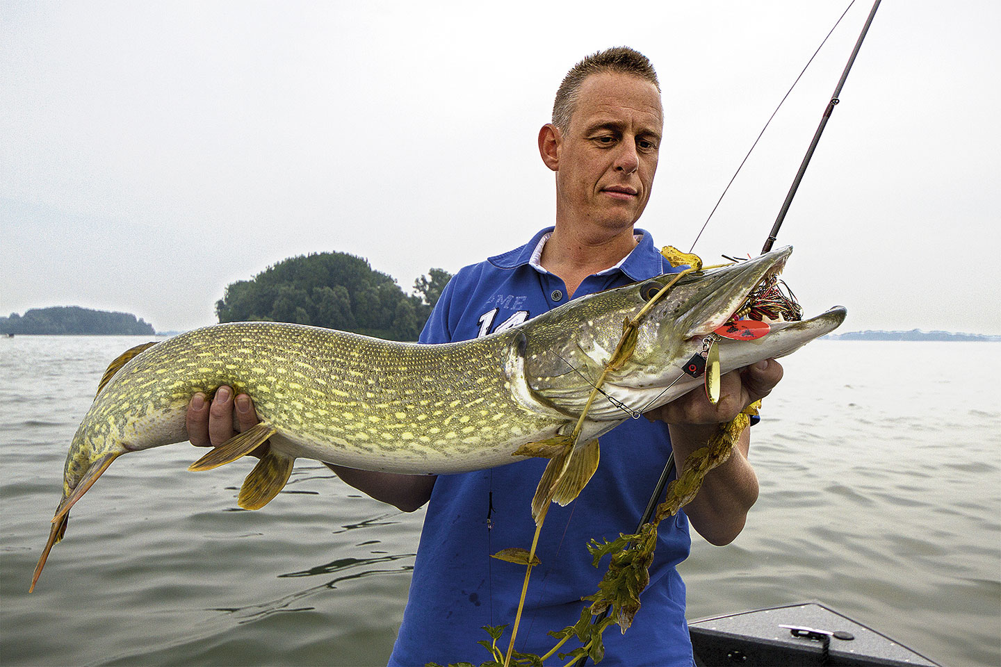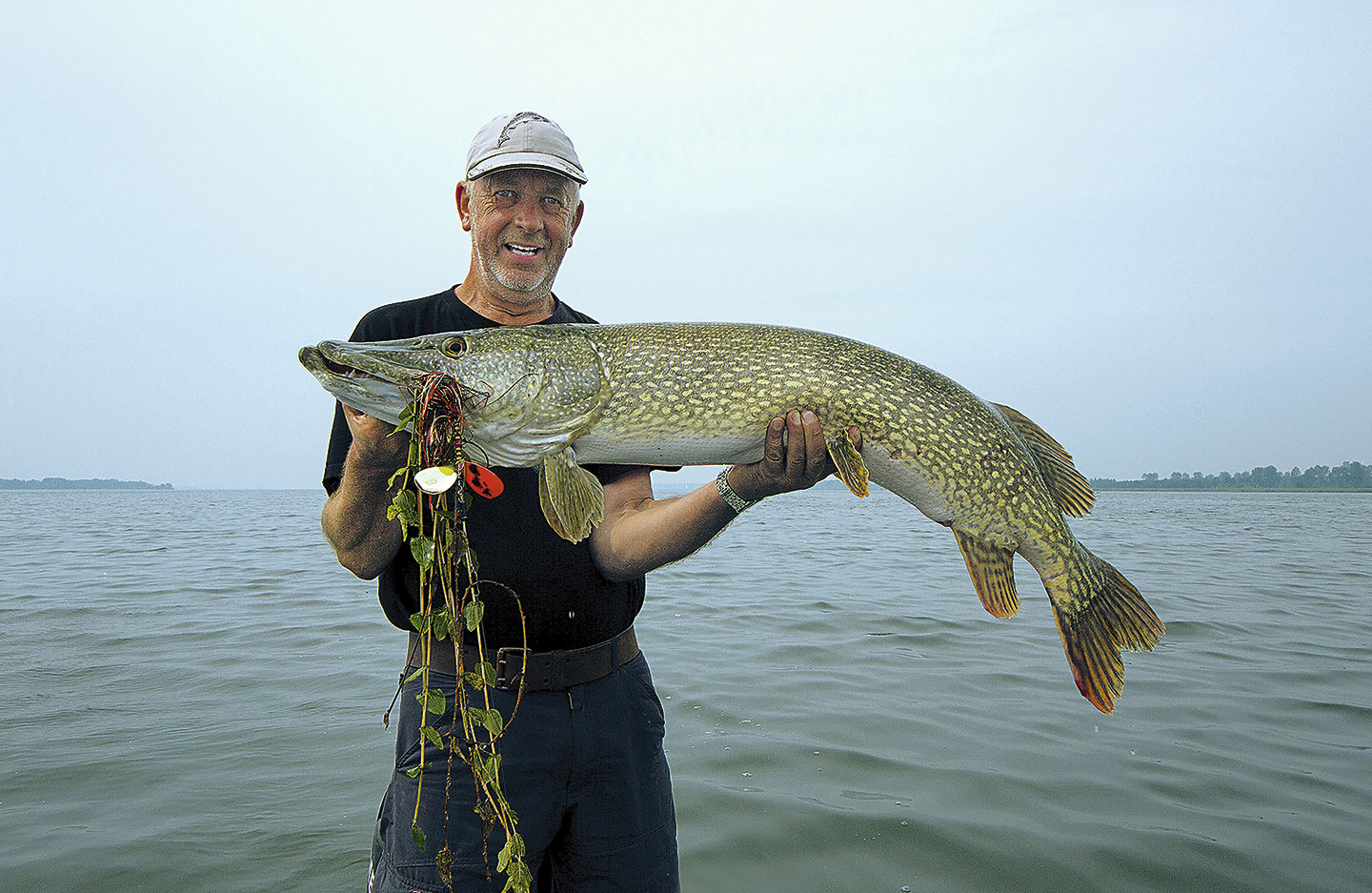 Die Mehrzahl der Pflanzen ist zwar schön anzusehen, aber wie wollen wir in diesem Dickicht Hechte fangen? Man darf die Kraft der Pflanzen nicht unterschätzen. Verwenden Sie in solchen Situationen grundsätzlich eine starke, mindestens 0,22 Millimeter dicke Geflechtschnur und eine kräftige Rute mit einem Wurfgewicht zwischen 50 und 100 Gramm. Es ist selbstverständlich, dass man mit Ködern fischt, die zwischen den Pflanzen gut laufen. Wenn ich direkt im Pflanzendickicht fischen will, gibt es für mich nur einen Köder – den Spinnerbait. Einen Haken oder ein Tandem aus zwei Einzelhaken mit nach oben gerichteten Hakenspitzen kann man gut durch die Pflanzen führen. Wenn die Pflanzen sehr nahe beieinander stehen, zeigt meine Rutenspitze beim Einholen zum Köder. Fliegenfischer können an solchen Plätzen richtig abräumen und mit Streamern wahre Brocken fangen.