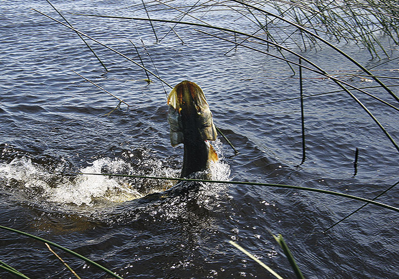 Eine ideale Kombination bilden dicht beieinander liegende Felder von Teichbinsen (Schoenoplectus sp) und Laichkraut. Eher zufällig fand ich einmal einen solchen Hotspot. Der Wind wehte an diesem Tag so kräftig, dass ich unser Boot fest verankern mussten, ehe wir zu werfen begannen. Es war ein total verrückter Tag, an dem wir eine Menge Hechte fingen, darunter auch einige Meterfische. Es gibt unzählige Varianten von Schilffeldern. Nicht an allen sind Hechte garantiert. Aber wenn die Halme so weit auseinander stehen, dass es zwischen ihnen noch genug Platz für andere Pflanzen hat, ist ein Fangerfolg fast schon garantiert.