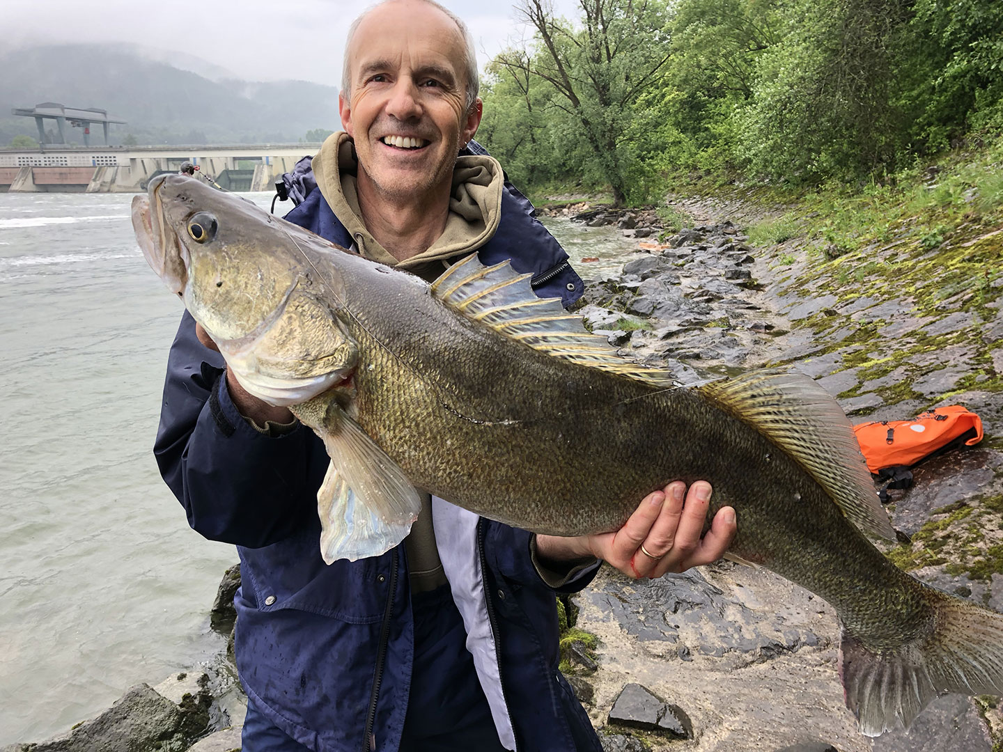 Am regnerischen Morgen des 17. Mai gegen halb neun konnte René Metzger aus Rheinfelden diesen stattlichen Zander in Stein, unterhalb des Kraftwerks Stein-Säckingen, fangen. Das Wasser war trüb und hatte etwa 14 Grad, die Temperatur betrug 12 Grad. Er freute sich riesig über diesen Ausnahmefang! Verwendetes Gerät: Shimano Beastmaster XH-Rute, Abu Garcia Card STX 40-Rolle, 0,12er-Climax-Geflochtene, 0,30er-Fluorocarbon, Stahlvorfach, Relax Kopyto-Gummifisch.