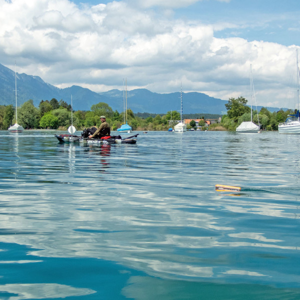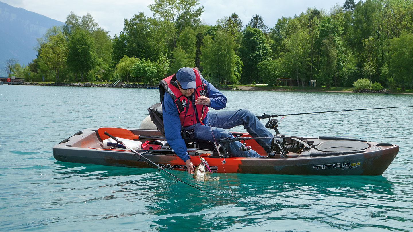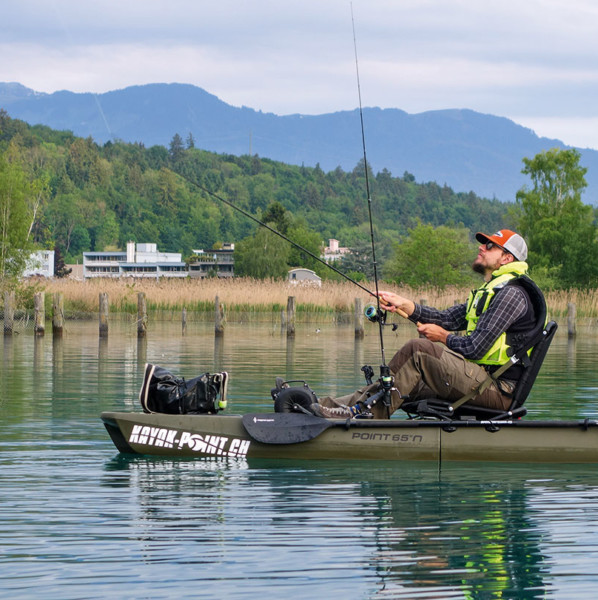 Nachdem die letzten «Räubergschichtli» am Mittagstisch erzählt und die Batterien aufgeladen sind, begeben wir uns wieder aufs Wasser. Das Einwassern, Parkieren und Einsteigen gestaltet sich mit den Kajaks erstaunlich einfach und so legen wir nach der Halbzeit schon einen ziemlich flotten Umgang mit den neuen Gefährten an den Tag. Wir fischen mit Tretkajaks, die über Schalter an den Seiten gelenkt werden können und wirklich leicht zu manövrieren sind. Mit den seitlich befestigten Rutenhaltern, den an verschiedenen Stellen des Kajaks angebrachten Löchern für weitere Ruten und je einer Ablagefläche vor und hinter dem bequemen Sitz ist auch Platz genug für alles da, was es für einen abwechslungsreichen und erfolgreichen Fischertag braucht.