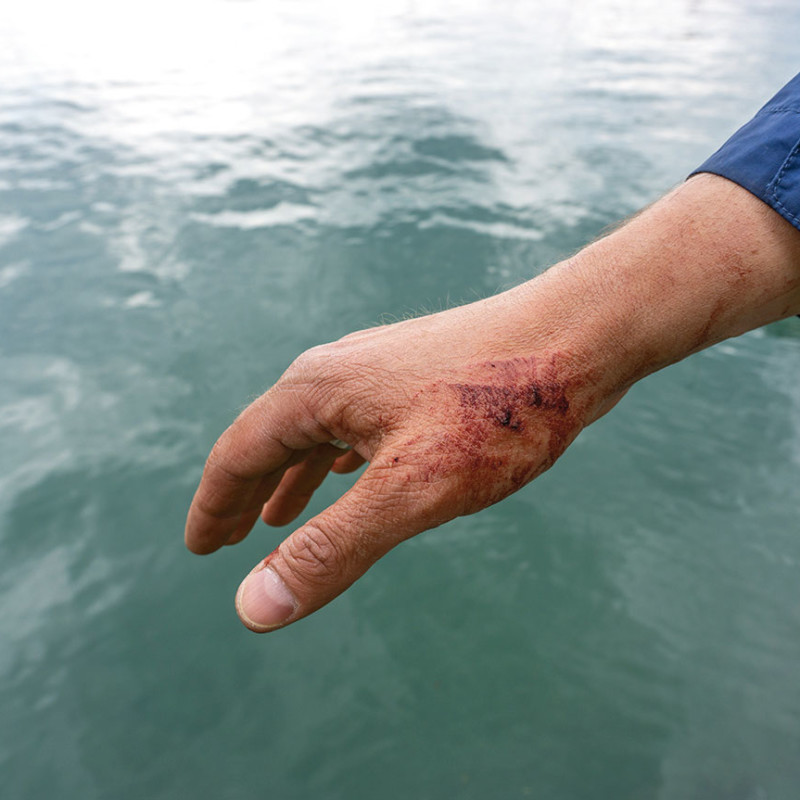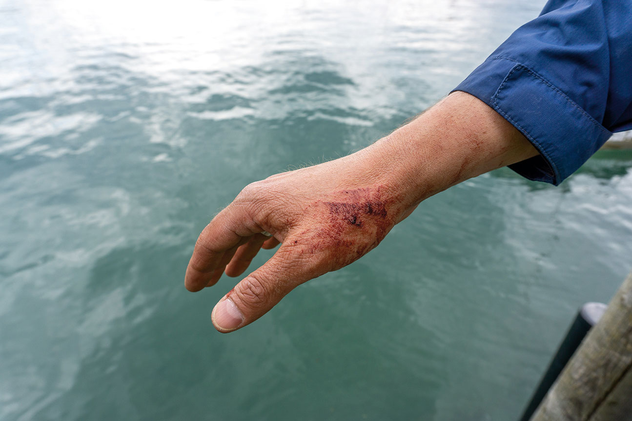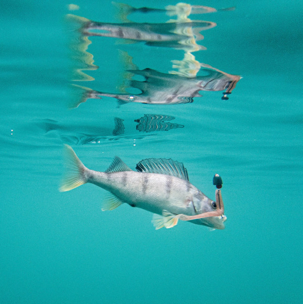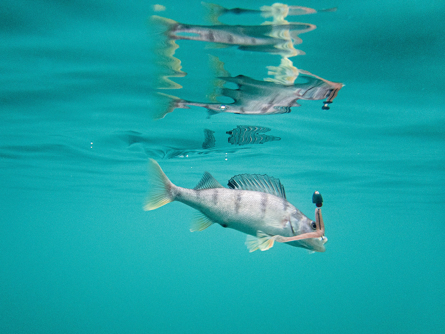 Trotz dieses Dämpfers fischen wir noch etwas weiter auf Felchen. Guide Urs, der ein paar Meter nebenan fischt und die Stelle vorgeschlagen hat, spielt seine ganze Erfahrung aus und kann in kurzer Zeit zwei Felchen landen. «Urs, ich muss wieder zu den Hechten», so Robins Kommentar. Das Felchenfischen bringt ihm offensichtlich kein Glück heute. Die 30 Meter zurück zur Hechtstelle sind rasch und ohne Aufbrausen eines Motors zurückgelegt. Diesmal sind es jedoch deutlich über 10 Würfe mit dem pinken «Weihnachtsbaum», bis es wieder einen harten Einschlag in Robins Rute gibt. Nach kürzerem Drill liegt diesmal ein 70er-Hecht neben dem Kajak im Wasser. Robin denkt an die morgendliche Handlandung von Urs und versucht es ihm gleichzutun. Weil man im Kajak so nah am Wasser ist, bietet sich das auch an. Allerdings muss auch der Kiemengriff beim Hecht geübt sein. Robins Hand ist nach dem Fang blutüberströmt, er strahlt aber trotzdem wieder. Ruben und Dominik zieht es derweil Richtung Thun, wo sie in der ausgedehnten Flachwasserzone bis vor Schadau kleinere Wobbler und Gummis schleppen, in der Hoffnung auf die gestreiften Räuber. Ruben probiert dabei auch den Einsatz von kleinen Ruten-Sideplanern beim Kajakfischen. Problemlos lassen sich damit vier Schnüre schleppen, das Kajak hält den Kurs trotzdem gerade und stabil. Fische steigen dabei aber leider keine ein. Zurück in Gwatt berichtet Urs von einem Egli, das er gerade beim Felchenzupfen an der Nymphe hatte. Das ist das Signal für Ruben. Er entscheidet sich darauf für einen Versuch mit Gummiwürmern am Texas-Rig in der Felchenzone, was auf Anhieb funktioniert: Er lupft bei jedem zweiten Wurf einen Stachelritter aufs Kajak.
