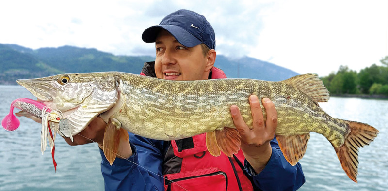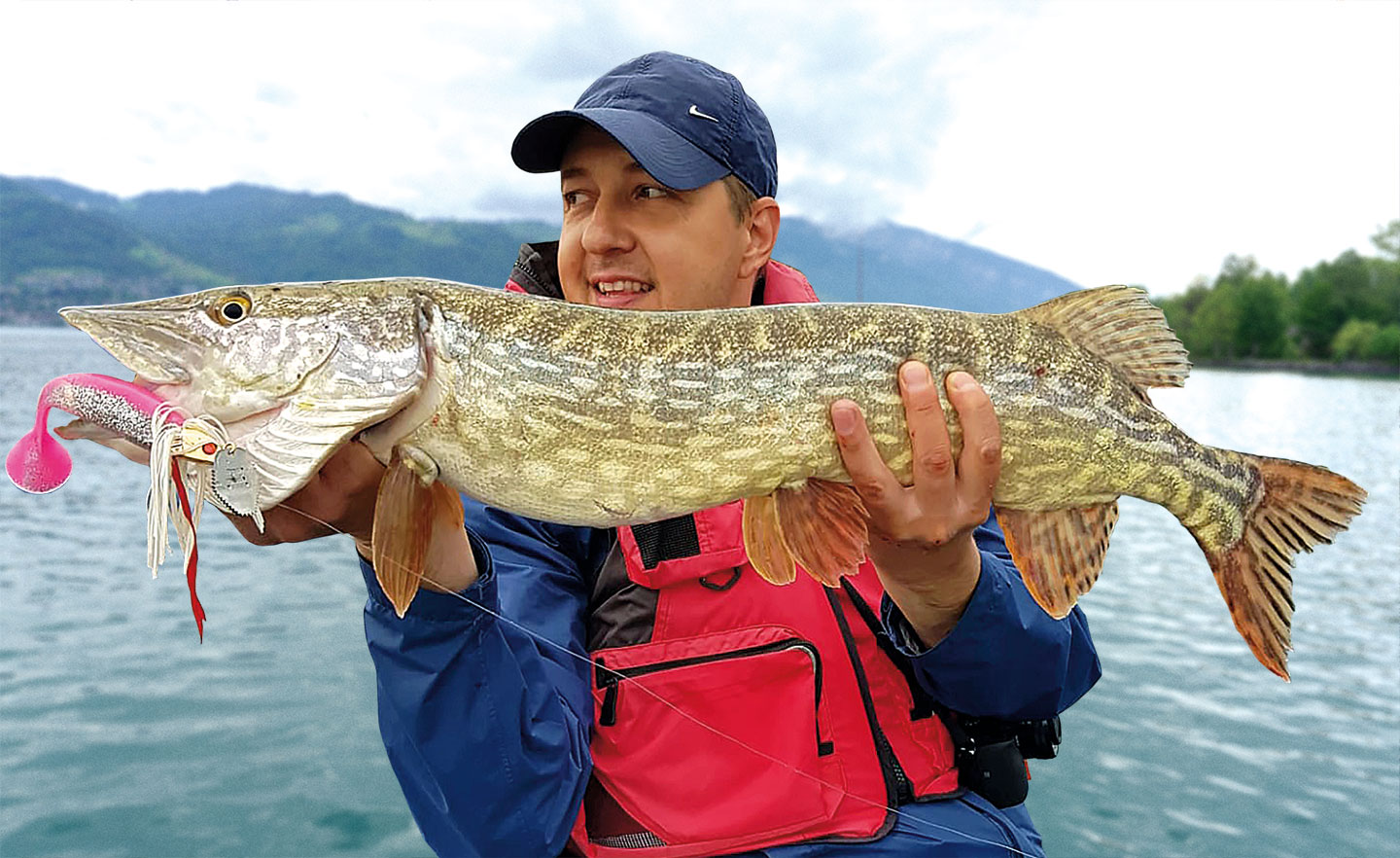 Zu Beginn schwärmen wir zwischen den geparkten Segelschiffen aus und machen hier die ersten Würfe. Möglichst naturgetreu und dezent fischen oder mit Schockfarben den Kontrast zum alpinen Wasser suchen? Robin entscheidet sich für einen pinken 6-Inch-Gummi am 50 Gramm schweren weissen Fransenjigkopf. Diesen lässt er bis zum Grund absinken und kurbelt ihn ohne grosses Gejigge hoch. Er erhofft sich, dass die Fransen ihre Arbeit auch ohne sein Zutun machen. Mit seiner Strategie liegt er offenbar richtig, denn es vergehen keine 10 Würfe, bis auf Robins Rute im Mittelwasser ein Mordsbiss erfolgt und die Rute sich mächtig krümmt. Für einen Moment herrscht etwas Hektik auf dem Wasser. Die anderen Kajaks fahren näher, um beim Spektakel mitzufiebern. Robins Kajak bewegt sich durch den Zug des Fischs und für ihn fühlt sich dieser Drill so unmittelbar und an den Fisch angepasst an wie noch nie. Schliesslich zeigt sich ein stattlicher 85er-Hecht, den Guide Urs mit einem Kiemengriff landet. Was für ein Kajak-Anfängerglück! Dominik berichtet im Anschluss noch von einem Nachläufer auf den grossen Hechtgummi und hochmotiviert schwärmen wir wieder aus. Doch bis zum Mittag passiert nicht mehr viel. Derweil die anderen es weiterhin mit grossen Ködern auf Hecht versuchen, fährt Ruben in den etwas weiter hinten gelegenen Mündungsbereich der Kander und versucht es mit schlanken Wobblern in der Hoffnung auf schwarz punktierte Räuber. Der Versuch war es wert, denn dabei konnte Ruben auch das beträchtliche Tempo und die Wendigkeit dieser Paddelboote ausloten. Mit dem Fischerkajak kommt man wirklich schnell auf dem Wasser herum und bewegt sich dabei erst noch leise. Möglicherweise braucht man damit auch weniger als die berüchtigten tausend Würfe, um an eine Seeforelle heranzukommen …