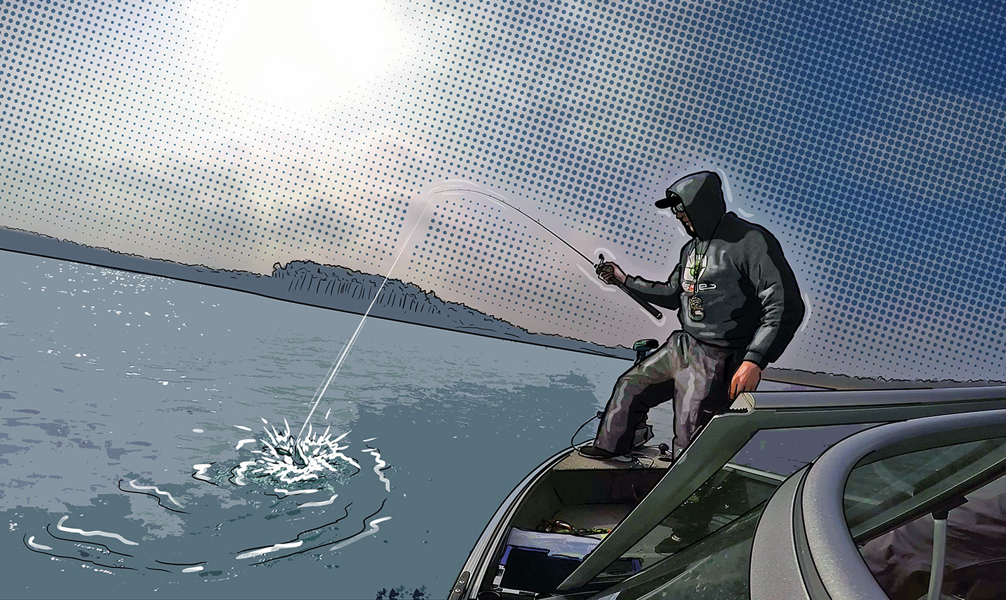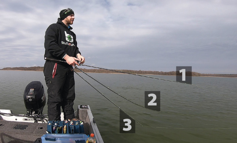 Die Ausrüstung steht. Nun zur Führung. Wie eingangs erwähnt, kommt Jerken von Rucken, nicht von Schlagen! Gerade zur Anfangszeit dieser Technik benötigten einige Köder einen wirklich sehr starken Ruck, um zur Seite hin auszuscheren. Aber die Köder haben sich stark weiterentwickelt und so brauchen die moderneren Jerks heutzutage oft nur eine sanfte Beschleunigung und einen ruckartigen Stopp, um gut zu laufen. Der Bewegungsablauf besteht im Wesentlichen aus zwei Teilen: Zuerst Ruck, dann Pause. Hier gibt es keinen Rhythmus, der immer funktioniert, weil jeder Köder etwas anders läuft. Wichtig ist, dass der Ruck in die etwas schlaffe Schnur erfolgt und man nach dem Ruck die Schnur auch noch straff lässt, damit der Köder Spielraum hat, um sich zu bewegen und zur Seite auszubrechen. Die Rutenspitze wird dazu ruckartig nach unten geführt und danach gestoppt. Die Spitze ist nun im unteren toten Punkt (UT). Jetzt lässt man den Jerkbait stehen und führt die Rutenspitze wieder nach oben (zum Ausgangspunkt), während man gleichzeitig etwas lose Schnur aufnimmt. Wenn die Schnur nur leicht schlaff und die Rutenspitze wieder auf der Ausgangsposition ist, wiederholt man das ganze von vorne.
