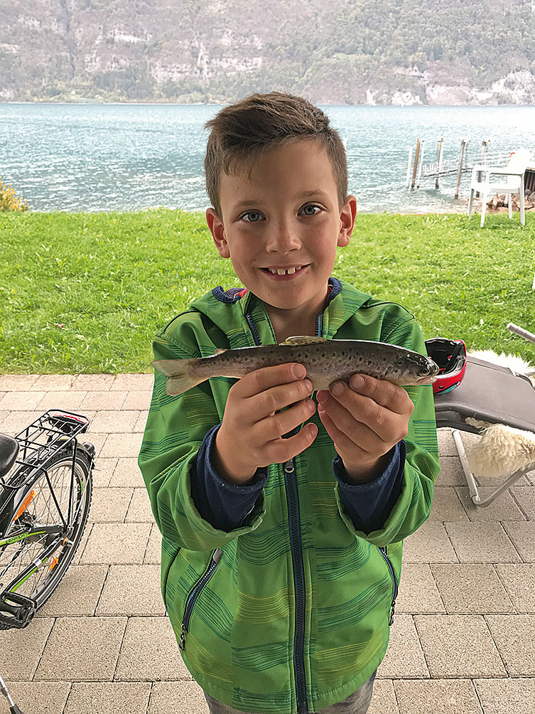 Der 8-jährige Laurin Czichollas aus Chur fischte im Oktober im Talbach am Walensee. Er hatte das Ziel, mit Bienenmaden eine Flussforelle zu fangen. Gegen 14.30 Uhr sah er eine solche und warf den Köder in ihre Richtung. Und «zack», biss sie zu! Dies war die erste Forelle in seiner Fischerkarriere am Walensee. Üblicherweise fischt Laurin im Walensee mit Gummiköder auf Egli.