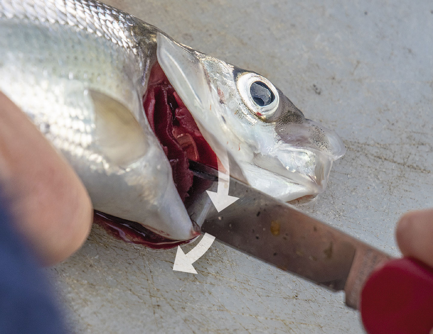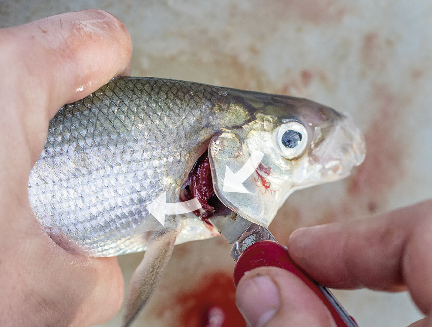 Anstatt die Arterie zu zerschneiden, gibt es auch die Möglichkeit, die Kiemenbögen komplett zu durchtrennen. Diese Variante ist sicher, und sofort setzt das vom Gesetzgeber geforderte Entbluten ein. Am 1. März, also vor knapp einem Monat, hat das Bundesamt für Lebensmittelsicherheit und Veterinärwesen (BLV) die «Fachinformation Tierschutz Nr. 16.5» herausgegeben («Fische fachgerecht töten»). Dort heisst es unter Punkt «Kopfschlag und Kiemenschnitt»: «Unverzüglich nach der Betäubung muss der Fisch durch einen Kiemenschnitt entblutet werden. Dazu sind entweder das Hauptblutgefäss zwischen dem Herzen und den Kiemenbögen oder die einzelnen Kiemenbögen mit einer scharfen Klinge zu durchtrennen.»