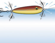Topwater-Stickbaits sehen entweder aus wie Zigarren oder wie nur zum einen Ende hin verjüngte Bananen. Die Öse sitzt bei den meisten Modellen nicht ganz vorne an der Schnauze, sondern etwas unterhalb. Ursprünglich wurden sie dafür konzipiert, Schwarzbarsche und nordamerikanische Hechtarten aus den Krautfeldern an den Haken zu locken. Bei uns fangen sie vor allem Hechte, Rapfen und Egli.